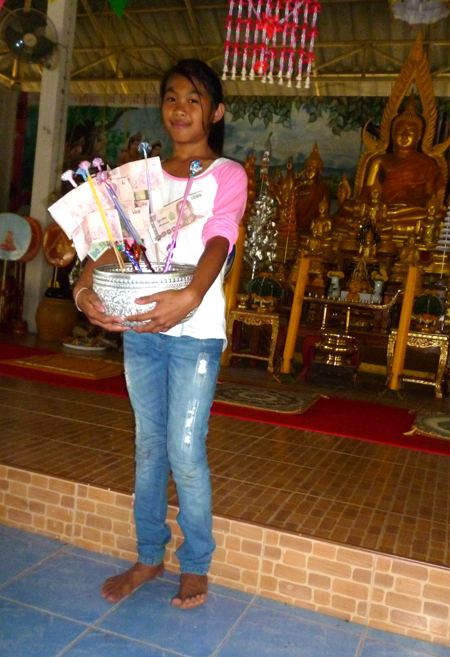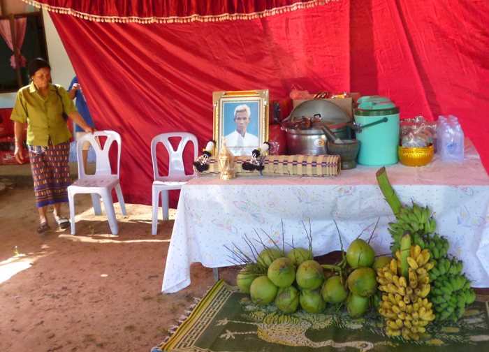 Jeden Nachmittag sitze ich auf dieser Bank vor der Kneipe meines Neffen. Ich rauche drei Zigaretten, trinke einen Kaffee und beobachte die Leute auf der Straße. Mir gefällt es, wenn die fünfköpfige Familie unseres Nachbarn auf einem Moped an mir vorbeifährt. Fünf Leute passen in Thailand locker auf ein Zweirad, vor allem, wenn drei Kinder dabei sind. Den fünfjährigen Dam hat der Vater vorne zwischen den Knien sitzen, die Mutter mit dem Baby im Arm sitzt hinten, und die siebenjährige Chailai klemmt zwischen Mutter und Vater. Und alle Fünf winken mir zu. Manchmal fährt ein Vogelkäfighändler auf einem Velo vorbei, der hat mindestens hundert Käfige geladen. Das ist einfach unglaublich! Am tollsten ist aber der Leiterverkäufer. Er fährt einen Töffli mit Beiwagen, auf dem er Leitern aller Größen feilbietet. Die Fünfmeteraluminiumleitern hat er der Länge nach gestapelt und ist somit fast so lang wie ein Minibus. Die zwei Meter langen Leitern hat er senkrecht in die anderen verkeilt, so dass das Gefährt mindestens drei Meter hoch ist. Zwischendrin sitzt noch sein Sohn, der die Leitern festhalten muss. Um dem Balanceakt die Krone aufzusetzen, fährt der Mann einhändig. Denn eine Hand benötigt er, um das Horn zu betätigen, mit dem er die potentiellen Kunden auf sich aufmerksam macht. Einmal habe ich ihm eine Leiter abgekauft, nur, um sein Gefährt besser aus der Nähe betrachten zu können.