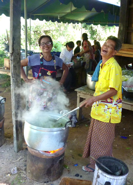 Im Haus von Bernis Schwiegereltern hätten wir drei Schwestern, also Bernis Mutter und seine zwei Tanten, wohnen können. Die wollten Strohmatten für uns ins Wohnzimmer legen. Das war ja sicher ehrlich und nett gemeint, aber wir drei Schweizerinnen waren damit doch etwas überfordert. Schon um dort zu essen, mussten wir uns überwinden. Die hatten nicht einmal eine richtige Küche, sondern haben im Hof gekocht. Ein Topf stand direkt auf einem Gestell über einer Gasflasche, der Wok auf einer Kochstelle am Boden über dem offenen Feuer. Einen Schüttstein oder Ähnliches gab es auch nicht. Immerhin hatten sie fließend Wasser, das aus einem Hahn an der Wand kam, ohne Abfluss natürlich. Für Anna, Bernis Mutter, war das Badezimmer der größte Schock. Es bestand nur aus einem Bambusmattenverschlag im Hof. Das WC war eine Hocktoilette, wie wir es auch von Italien kannten, nur ohne Wasserspülung. Spülen musste man von Hand, indem man mit einer Plastikkelle Wasser hineinschüttete. Es gab auch kein Lavabo, nur zwei betonierte Wasserbecken, ein kleineres für die Toilette und ein großes zur Körperreinigung. Berni hat uns vorgeführt, wie das Duschen hier geht, denn seine Mutter konnte es sich absolut nicht vorstellen. Mit einem Plastikschüsselchen leerte er Wasser über seinen Körper, dann seifte er sich ein, und am Schluss begoss er sich wieder. Er erklärte uns, dass sich die Thais immer bekleidet duschen, weil sie so schamhaft sind. Das fand seine Mutter besonders unhygienisch. Heute leben Bernis Schwiegereltern weitaus komfortabler, in vielen Dörfern der Bergstämme dagegen sind die sanitären Einrichtungen noch sehr primitiv. Ich habe mich längst daran gewöhnt, aber damals, als wir direkt aus der sterilen Schweiz in dieses thailändische Dorf kamen, waren wir - wie soll ich sagen - etwas pikiert.