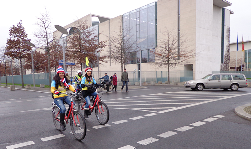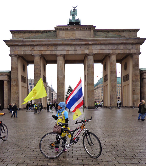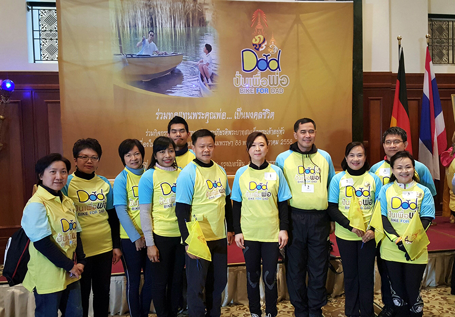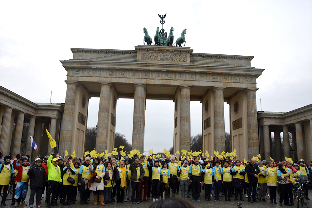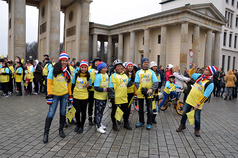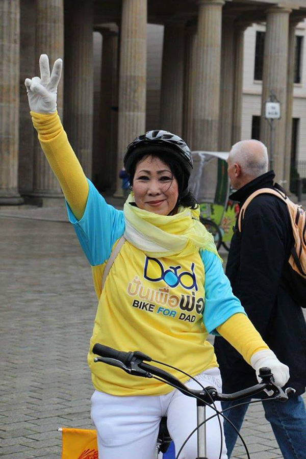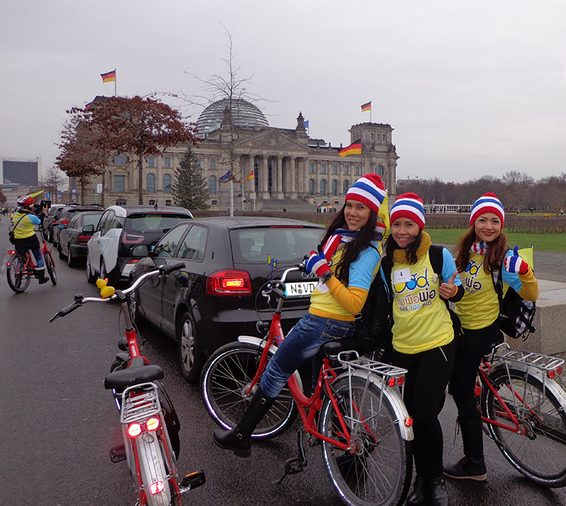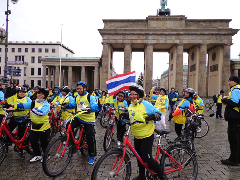 In Berlin wurden das Event BIKE FOR DAD von der Thailändische Botschaft organisiert. Alle Interessenten hatten sich Wochen vorher in Listen eingetragen um eines der beliebten T-Shirts zu erwerben, die Listen wurden dem Glückwunschschreiben an den König beigefügt. Gegen 10 Uhr trafen sich alle im Hotel ADLON, wo die Botschafterin, gegen 11 Uhr eine Ansprache hielt und den Ablauf des Fahrradkorsos erläuterte. Gemeinsam ging es zu Fuß zum Brandenburger Tor für ein kurzes Fotoshooting, die meisten in ihrem blaugelben T-Shirts mit dem Logo von BIKE FOR DAD, um ihrem König Respekt zu erweisen. Mit Polizei-Eskorte und der Botschafterin an der Spitze ging es nun los: vorbei an der Siegessäule, Kanzleramt und Reichstag, also einmal ums Regierungsviertel, und dann zurück zum Brandenburger Tor.