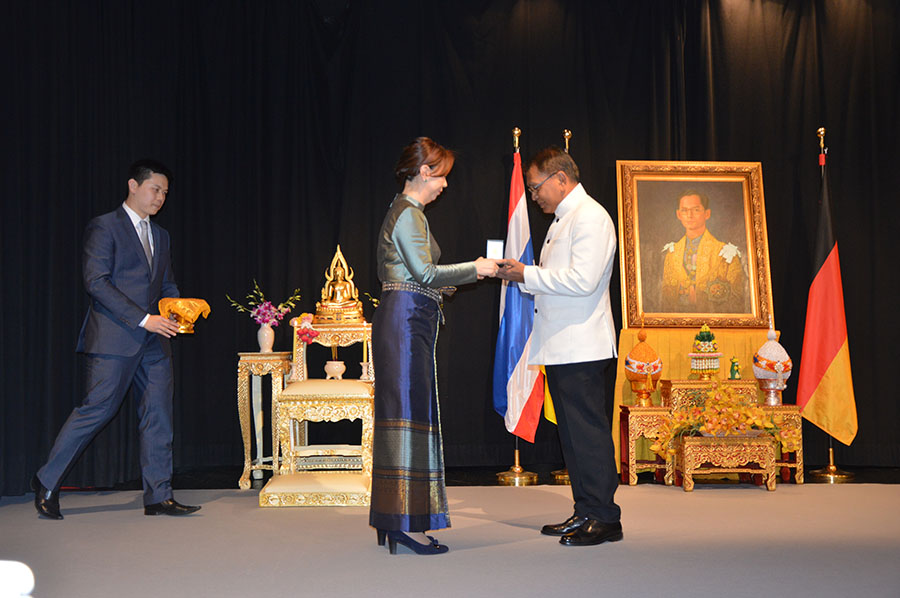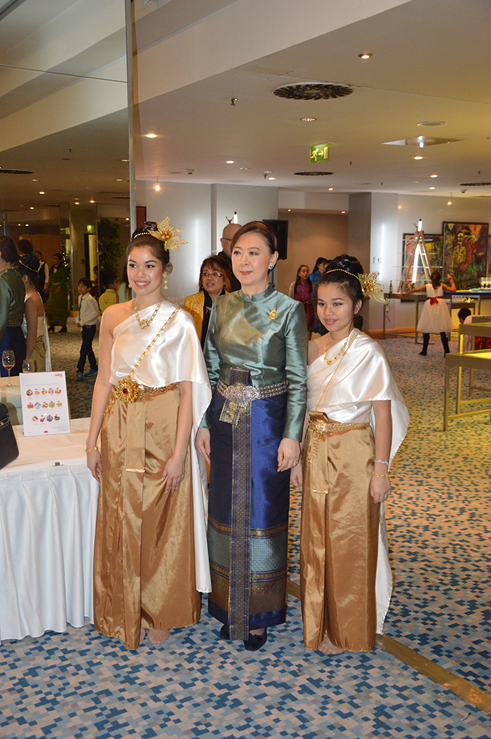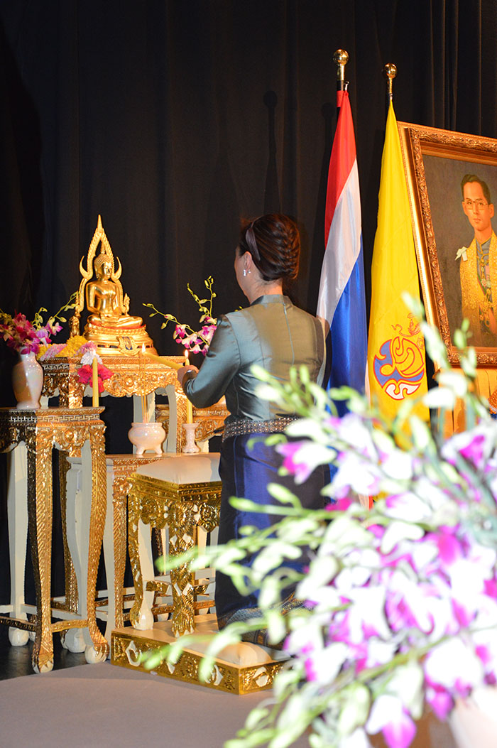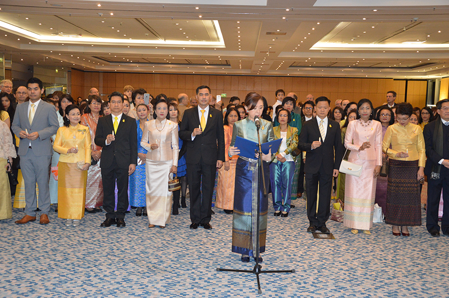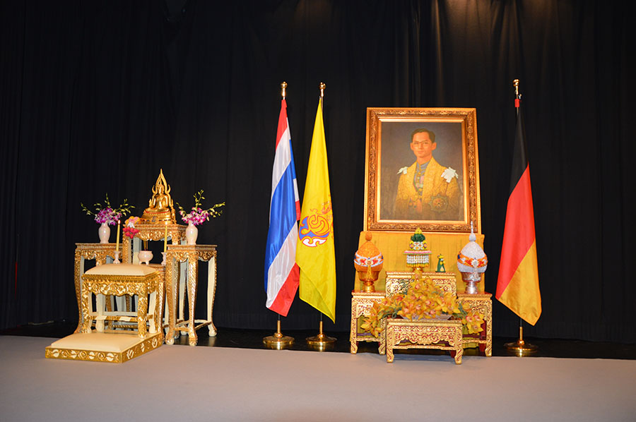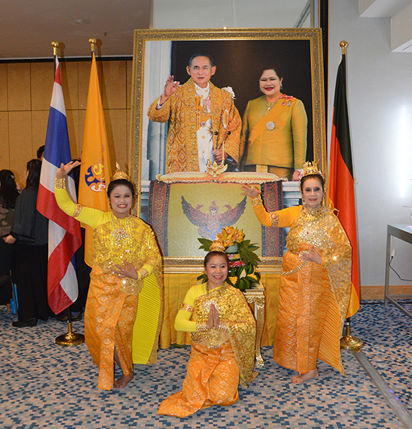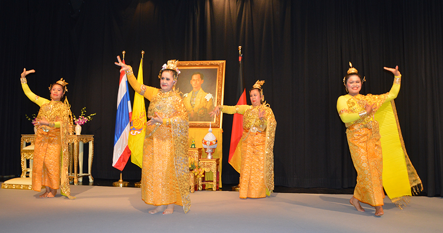 Eine Feierlichkeit anlässlich des 88. Geburtstages des thailändischen Königs, Seiner Majestät Bhumibol Adulyadej fand für die Öffentlichkeit am 4. Dezember in Berlin im Fest-Saal des Maritim ProArte Hotels in der Friedrichstraße statt. Wie auch schon am 1. Dezember bei dem diplomatischen Festakt im Hotel ADLON (für geladene Gäste) hielt auch hier die Botschafterin Nongnuth Phetcharatana eine Ansprache, um dem König die Glückwünsche zu übermitteln. Gemeinsam mit den etwa 450 Gästen sang die Botschafter die Thai Hymne, die sie mit einer Kerze in der Hand anstimmte, um dem König Respekt zu erweisen. Nach dem offiziellen Teil wurden die Gäste mit allerlei Thai Kultur in Form von Tanzdarbietungen, Gesängen und Muay Thai Kämpfen unterhalten, wobei sich alle am großzügigen Buffet erfreuten. Das "Geburtstagskind" König Bhumibol Adulyadej kann stolz auf seine Landsleute in der Ferne sein. Auch wir vom FARANG Magazin wünschen dem König Gesundheit und ein langes Leben! In diesem Sinne: Long live the King! Peter Phetkhieo