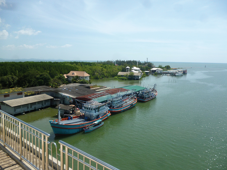Aber was ich da auf dem Meer erlebte, ließ mich erschüttern. Ein großes Schiff hatte eine komplette Mülladung ins Meer verklappt. Unmengen Abfall und Stüroporbehälter schwammen an der Oberfläche. An den Inseln merkte man davon nichts. Dort war es schön. Aber die nicht umweltgerechte Müllentsorgung hinterließ in mir einen bitteren Beigeschmack. Auf der Insel Ko Samet macht man es nicht viel besser. Dort wird der Müll verbrannt. Aber dann war er wenigstens weg. Im Meer landet er auf dem Grund und was nicht untergeht, wie erlebt, am Strand. In Laem Mae Phim verabschiedeten wir uns von Olaf und Bu. Sie machten noch einige Tage Urlaub auf der Insel Ko Samet. Ein Bericht und Fotos sollen folgen, hat mir Olaf versprochen. Wir reisten weiter der Küste entlang nach Laem Son. Es ging durch eine imposante Fluss-Delta-Landschaft. Hier hat Weau nach ihrer Schulausbildung in einer Fischverwertung gearbeitet. Damals gab es noch keine Brücken über den Fluss. Heute ist dies ein schöner Ausflugsort mit einer großen Brücke. Aber Strände gibt es dort nicht. Wir beendeten hier unsere Reise und fuhren zurück in unser Dorf im Isaan.