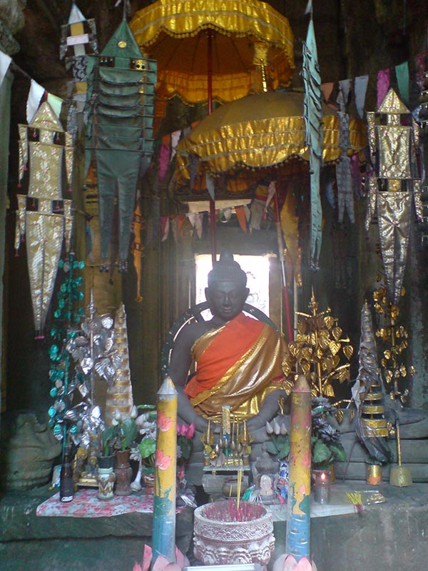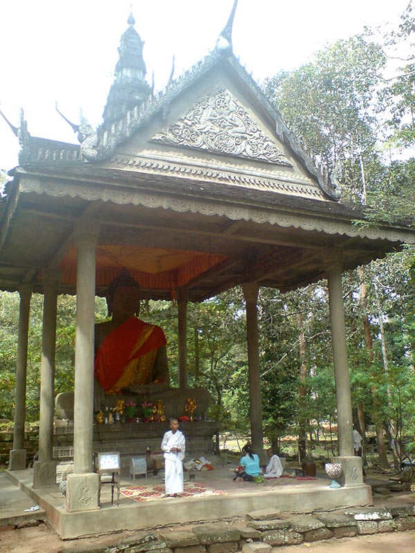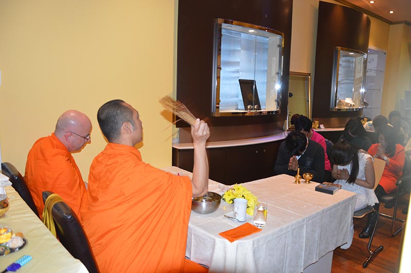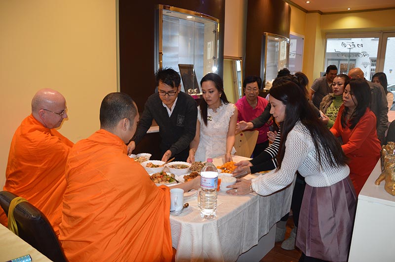 Beim Betreten eines Wat werden immer die Schuhe ausgezogen. Vor dem Buddha Abbild kniet man nieder, wobei die Männer in der Regel auf den Fersen sitzen und die Frauen ihre Beine seitlich aneinander legen. Die Fingerspitzen der gefalteten Hände werden bis zur Stirnhöhe oder Kopfende gehalten. Danach neigt man insgesamt dreimal den Oberkörper nach vorne, wobei die Handflächen jedes Mal, wenn der Kopf fast den Boden berührt, auf den Boden gelegt werden.