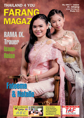 Serie (3): Über das Leben des Königs Bhumibol Adulyadej Werner Röpke exclusiv: Projekt des Königs Hochzeit in Berlin Thai Spa Vereinigung RA Bümlein informiert: Über den Mindestlohn Leseprobe von Franky Tipps vom TAT Ching schreibt in Thai Vorgestellt: Deutscher Hilfsverein Edds Kolumne Kleinanzeigen News aus Thailand Reise-Tipps Thailand Adressen-Service Silvester im Scorpion Franky im Isaan Der Herausgeber: Meine Reise in den Isaan Aus den Wats |