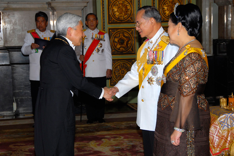 Ist der Einfluss des Königs in der Innenpolitik des Landes deutlich wahrnehmbar und wie an den Beispielen gezeigt, auch durchaus von Erfolg gekrönt, so beschränkt sich der außenpolitische Einfluss auf gelegentliche Staatsbesuche in ausgewählten Ländern, die für Thailand entweder wichtige politische oder wirtschaftliche Partner sind. Der Einfluss des Königs beschränkt sich hier natürlich auf die Anbahnung hauptsächlich von Wirtschaftsbeziehungen und freundschaftlichen Beziehungen zu den Regierungen der besuchten Länder. Der König hat sich in seiner Regierungszeit, soweit bekannt, nicht in aktuelle Konflikte Thailands mit seinen Nachbarländern eingemischt (z.B. Grenzauseinandersetzungen mit Kambodscha, Unterstützung von muslimischen Rebellen in Süd-Thailand durch Malaysia, Flüchtlingsströme aus Myanmar nach Thailand), diese Probleme waren Sache der jeweiligen Regierungen.