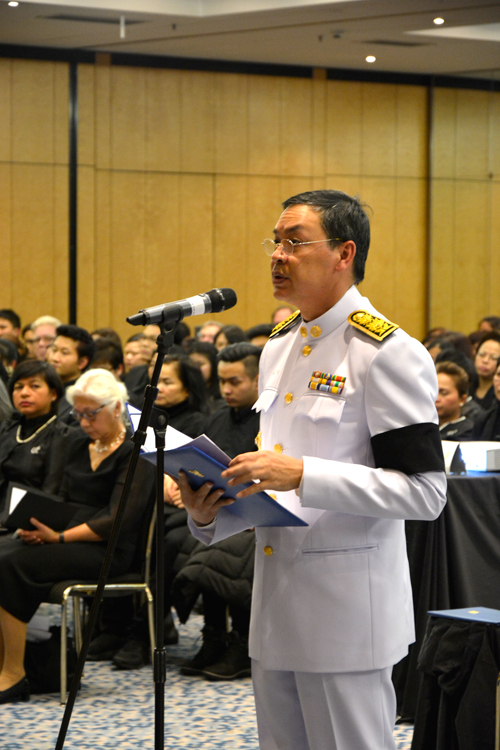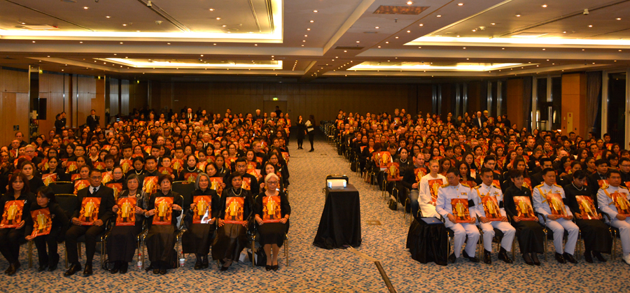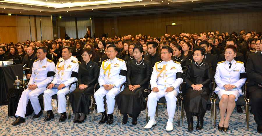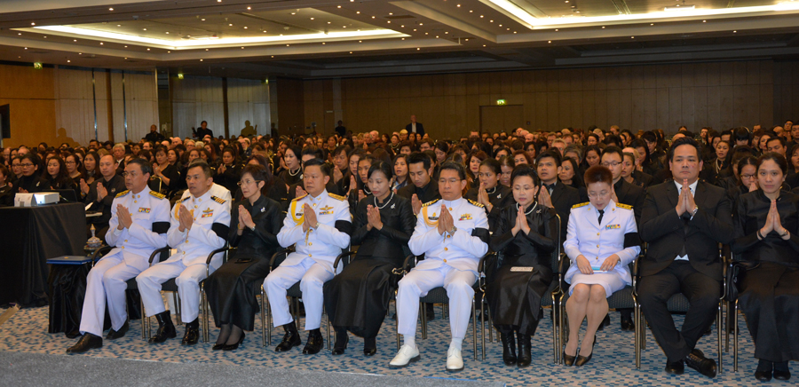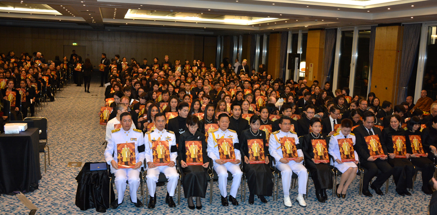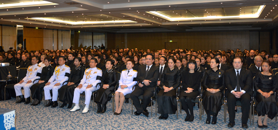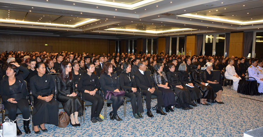 Während der Trauerrede des neuen Botschafters, S.E. Herr Dr. Dhiravat Bhumichitr, wurde im Hintergrund ein Video über das Leben von Seiner Majestät Bhumibol Adulyadej ausgestrahlt. Die Ehrengäste sowie viele andere Gäste übergaben Präsente und verbeugten sich tief vor dem Porträt des Königs. Die Botschaft stellte eine Auswahl von Aktivitäten und Entwicklungsprojekten Seiner Majestät Bhumibol Adulyadej vor und ließ zusätzlich den Thailändern die Möglichkeit ihre persönlichen Gefühle durch Schreiben zu äußern, in dem sie ihre Gedanken über das Ableben des geliebten Monarchen auf einem Zettel niederschrieben und diesen an einer gemeinsamen Tafel aufkleben konnten. Zum Schluss sagen alle Anwesenden gemeinsam die "Sansoen Phra Barami" die Hymne zur Lobpreisung des Königs (Thailändische Königshymne). Die in Trauer-Schwarz festlich gekleideten Gäste trugen zumeist Königsbilder mit sich und hatten eine Schleife oder eine schöne Brosche mit der Zahl 9 (Gao für RAMA IX.) am Revers. Peter Phetkhieo