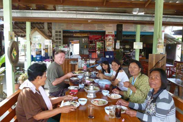 Vor dem Eingang weisen zwei naturgroße Steinelefanten den Weg zur Kasse. Hier herrscht bereits Hochbetrieb. Manager Klaus Jürgen betreut ein koreanisches Filmteam. Er schickt uns Global Marketing Supervisor Wan-Anusorn Juapmee zur Begrüßung. Ein Boot ist für uns reserviert. Die leise Fahrt vorbei an vielen Läden, unter mehreren kleinen Stegen, wo der Kopf eingezogen werden muss, oder an Booten, die köstliche Speisen anbieten, ist eines der Highlights. Angelandet wird am Steg, der direkt zur klimatisierten Halle mit handwerklichen Souvenirs führt, am anderen Ende des Geländes. Auf dem Rundweg sind etwa 130 Pavillons auf Stelzen errichtet worden, die eine Fülle von thailändischen Handwerksprodukten aus vier Regionen anbieten. Die regionalen Küchen sind eine Gaumenfreude. Erfreulich sind auch die Preise, die sich nicht von einem normalen Markt unterscheiden.