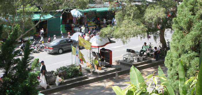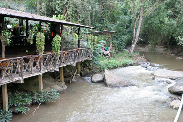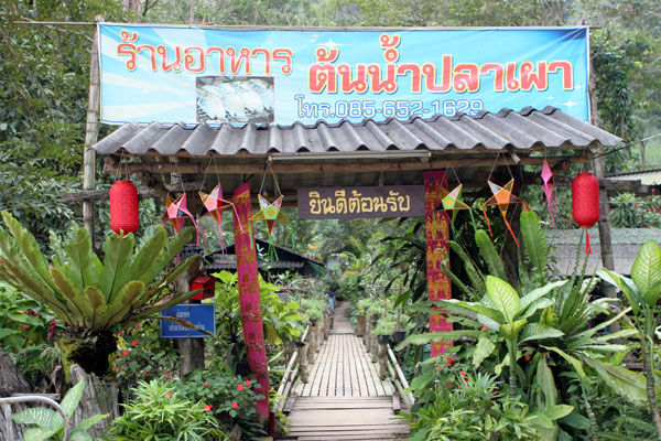 Weiter geht es bergab, Richtung Stadt. Unser Driver fährt sehr umsichtig. Die Aussicht in die im satten Grün leuchtenden Täler ist einfach super. In jeder Senke, in jedem Tal, auf jeder Erhöhung gibt es Neues zu entdecken. Vor allem entdecken wir eine hellblaue Bespannung über einem einladenden Eingang mit der Aufschrift in Thai: Restaurant, Ton nam pla pau. Also Stopp und rein. Die schmale Brücke zum Restaurant erweckt auf den ersten Blick keinen vertrauenswürdigen Eindruck, was Tina mit gemischten Gefühlen erfüllt. Keine Angst, die Brücke ist stabil. Etwas vorsichtiger muss man über den weitergehenden Steg laufen. Die Bretter sind ganz schön verbogen. Tische und Bänke fügen sich harmonisch in die Umgebung ein. Die idyllische Ruhe tut gut. Geredet wird kaum. Zu hören ist nur das plätschernde Wasser, das den Weg durch Steine und Felsen in die Tiefe sucht. Das bestellte Essen ist preiswert, vor allem aber lecker. Gebratenen Reis, gegrillten Fisch, Nudeln und Cola in Dschungelatmosphäre hat man auch nicht jeden Tag. Wir genießen die Zeit, bleiben ein wenig länger als geplant. Trotz der verlockenden Ruhe brechen wir auf. Denn auf uns wartet: