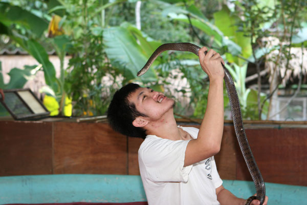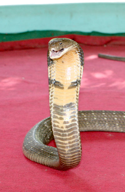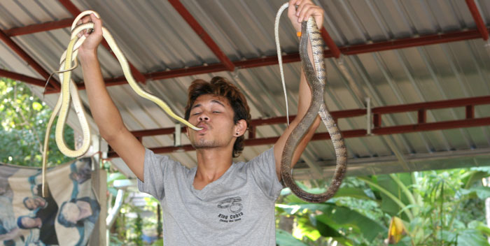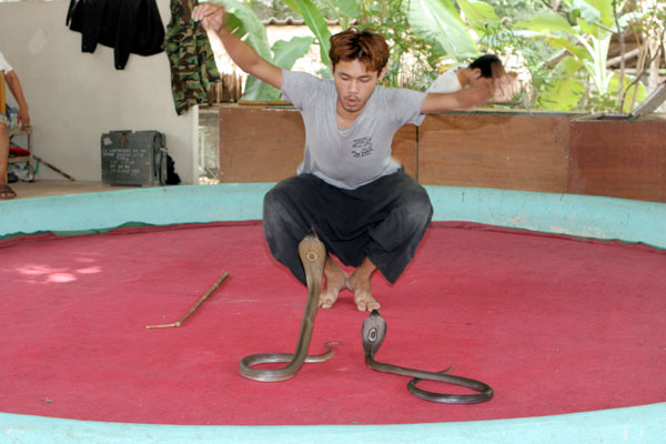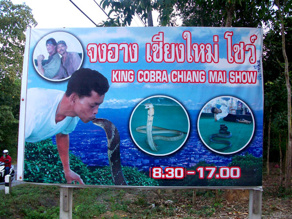 In dieser wundervollen Gegend des Doi Suthep werden mehrere Schlangenshows angeboten. Die Vorstellungen der "King Kobra Show" sind direkt von der Straße erreichbar. Hinter dem Entree sind halbkreisförmig Reihenbänke aufgebaut. Gegenüber stehen die Kisten mit den Schlangen. Mittig befindet sich der Ring, in dem die Vorführung stattfindet, etwa 5 Meter im Durchmesser und mit einer Umrandung von etwa 40 cm Höhe. Zur besseren Sicht ist der Boden mit rotem Belag ausgelegt.