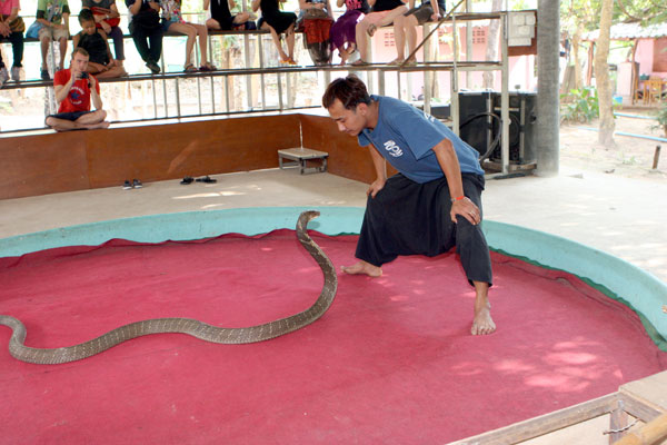 Der erste der Schlangenbeschwörer nimmt zwei Najas mit in den Ring. Die Schlangen heben sofort den oberen Teil mit weit gespreiztem "Kragen". Sie sind aggressiv, wollen beißen, finden zum Glück kein Ziel. Um die Kobras noch mehr zu reizen erhalten sie eine Rückenmassage. Das gefällt denen gar nicht. Sie gehen sofort wieder in Angriffsstellung. Als Highlight dieser Vorführung bekommt das Kriechtier zum Dank ihrer Mitarbeit einen Kuss genau zwischen die Augen. Um zu zeigen, dass die Schlangen noch über funktionsfähige Giftzähne verfügen, wird eine Kobra vor den Zuschauern gemolken. Jeder einzelne Gast kann sich hiervon aus nächster Nähe überzeugen. Die doch sehr nahe Prozedur gefällt Tina überhaupt nicht. Mit einem uns entfremdeten Gesicht schaut sie lieber zu den Holzpfosten am anderen Ende. Und die Gänsehaut bleibt auch eine Weile. Der zweite Akteur greift in eine Kiste. Ein längliches Etwas fliegt durch die Lüfte und landet in dem markerschütternd schreienden Publikum. Der Gedanke, ein hochgiftiges Reptil um die Ohren zu kriegen, ist jedoch schnell aufgeklärt, als eine junge Thaifrau ein gefärbtes Seil in den Händen hält. Der Scherz saß.