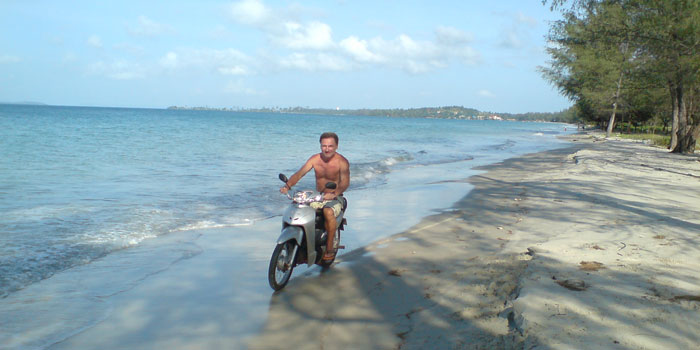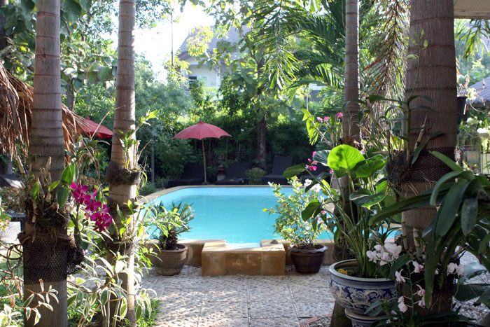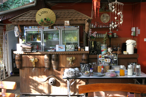 Das kleine Ferienparadies wurde nach viel Eigenaufwand im November 2008 eröffnet. Die Begrüßung von Daphne und Ron hat europäisch-thailändischen Charme. Die Beiden sind auf Anhieb sympathisch. Verständigungsprobleme gibt es nicht. Das Guesthouse bietet 8 Zimmer an. 4 im Erdgeschoß, 4 im ersten Stock. Sauber, großzügig dimensioniert, einfach, aber sinnvoll eingerichtet steht die Wahl zwischen Einzel- oder Doppelbetten. Die Miniterrasse mit Tisch und Stühlen betrachten wir eher als Raucherecke. Flachbildschirm-TV, DVD-Player, Wasserkocher, Kaffee und Tee, alles da, was zum angenehmen Aufenthalt beiträgt. Kernstück ist der Pool in Nierenform. Zugegeben, Schwimmen ist nicht, zum Abkühlen und Rumpaddeln ist das kühle Nass aber ausreichend bemessen. Liegen sind genug vorhanden. Das rundherum gepflanzte Grün vermittelt tropische Wohlfühlatmosphäre. Der gewählte Name Suan Dok Mai, Blumengarten, passt wie die Faust aufs Auge. Liam ist der Sohn. Mit unseren Flaschengeistern Singha und Heineken soll an dieser Oase der Ruhe der heutige Abend beendet werden. Am folgenden Morgen beklagt sich Tina über Rückenschmerzen. Grund dafür scheint die etwas ausgelegene Matratze zu sein. Daphne wird hiervon in Kenntnis gesetzt. Jetzt zeigt das Liams Suan Dok Mai seine Serviceleistung; denn während wir uns dem holländischen Frühstück hingeben, werden sämtliche Doppelmatratzen von einer Firma ausgetauscht. Also schneller geht es wirklich nicht.