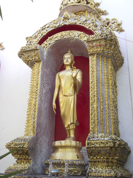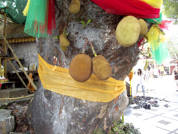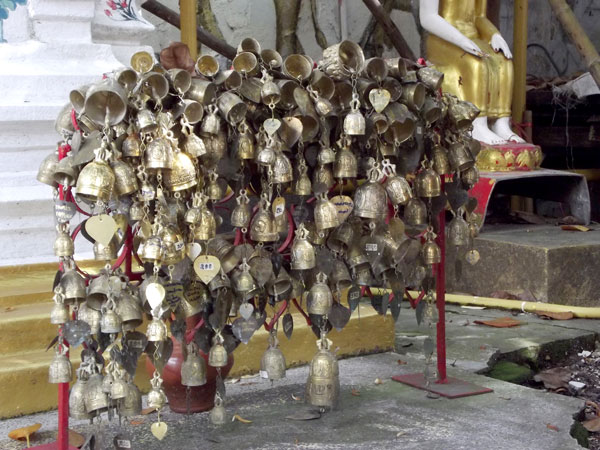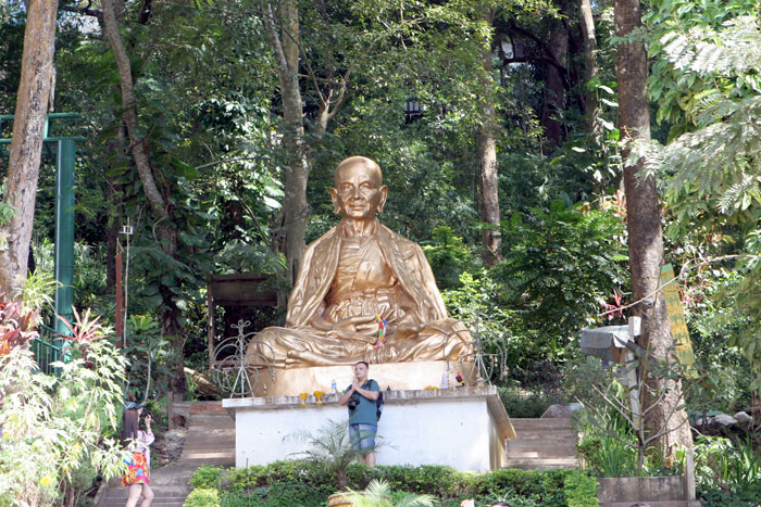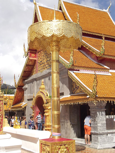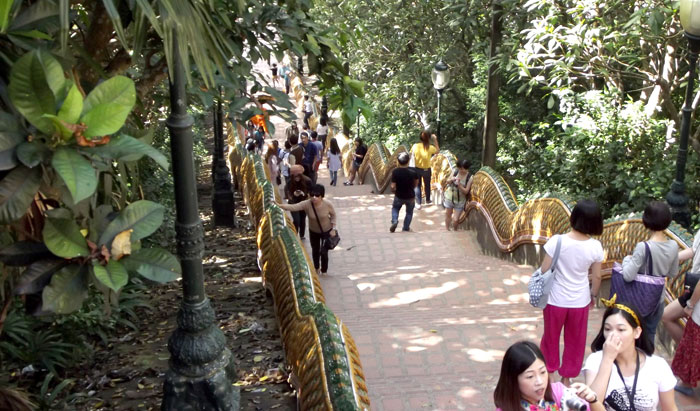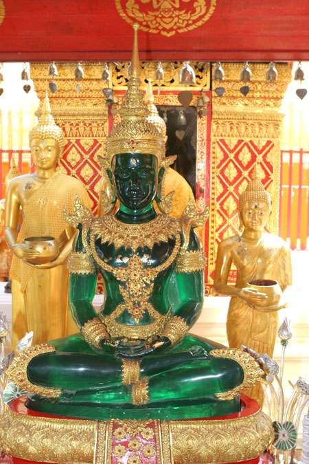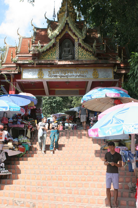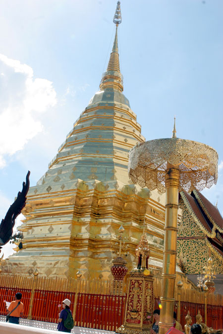 Für die bevorstehenden Ausflüge wird ein alter Freund engagiert. Jed tourt mit seinem bequemen Van Touris durch die Gegend. Zwar ist die Anreise von Chiang Rai (etwa 200 km) für ihn recht weit, jedoch nimmt er das gern in Kauf. Das erste Ziel ist der weithin bekannte Tempel Wat Phra That Doi Suthep. Das Wahrzeichen der Stadt liegt 15 km außerhalb von Chiang Mai auf dem gleichnamigen Berg. Er gehört zur Daen-Lao-Bergkette. Nach einer kurvenreichen Fahrt kommen wir zum Fuß der Tempelanlage. Alles scheint auf Touristik getrimmt zu sein. Ungezählte Geschäfte bieten Essen, Getränke und Souvenirs an. Selbst an der zum Tempelbezirk hinaufführenden Treppe, die von 2 großen Nagas (Schlangen) flankiert wird, warten, zumindest im unteren Teil, Verkaufsstände auf zahlungswillige Kunden. Über die Anzahl der Stufen bleiben wir im Unklaren. Die einen schreiben was von 200, die anderen was von 290 Stufen. Wir haben sie nicht gezählt. Der schräge Aufzug, der früher nicht überdacht war, ist doch viel bequemer. Erstaunt über die vielen Besucher huschen wir im Vorhof am Glockenspiel vorbei und genießen im hinteren Teil die atemberaubende Aussicht auf die Stadt. Auf dem Rundgang beeindrucken Buddhafiguren in jeglicher Form und Gestalt, genauso wie Elefanten aus Stein und Figuren aus der Mythologie. In Gebetshäuschen knien Gläubige und beten. Zwischen den Kapellen sind kleine Gärten kunstvoll angelegt. Zwei Treppen führen zur oberen Terrasse, dem eigentlichen Heiligtum. An den Wänden ist in Bildern die Tempelgründung beschrieben. Die Schuhe bleiben vor den Stufen, barfuss gehen ist respektvolle Pflicht. Im Zentrum ragt der achteckige vergoldete Chedi in den azurblauen Himmel. Die quadratische Umzäunung ist im oberen Drittel ebenfalls vergoldet. Am Tempelfuß fällt der smaragdfarbene Jadebuddha, der aus Kristall gefertigt wurde, ins Auge. Langsam wird der Besucherstrom immer größer. Wir wollen dem Gewimmel entrinnen und verlassen den wunderschönen Tempel. Wer mehr darüber nachlesen möchte, greift sich die FARANG Ausgabe 3-2011 oder öffnet die Website.