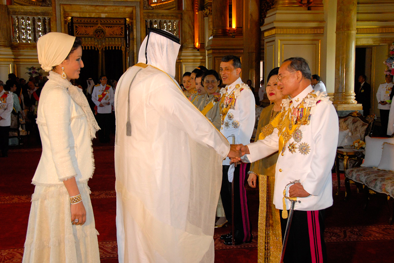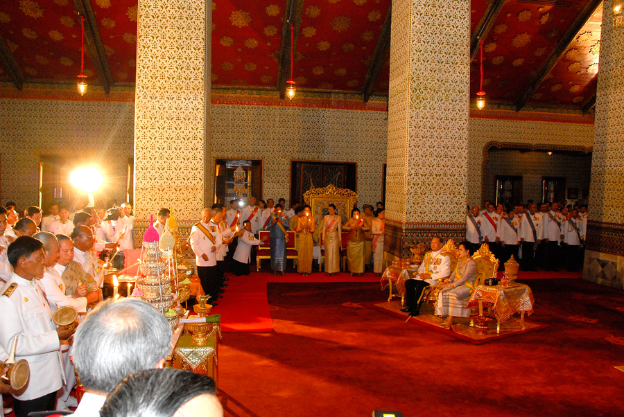 3) Das Schwert des Sieges, auf Thai: Phra Saeng Khan Chaiyasi. Das Schwert repräsentiert die militärische Macht des Königs. Der Griff ist 25.4 cm lang, das Blatt hat eine Länge von 64.5 cm. Wenn es in der Scheide aufbewahrt wird, hat das Schwert eine Länge von 1.01 m und ein Gewicht von 1.9 kg. Der Nacken des Schwertes zwischen dem Griff und dem Blatt beinhaltet eine goldene Miniatur von Vishnu, der den Garuda reitet. Die Geschichte des Schwertes ist von Mythen und Legenden umgeben. Im Jahr 1784 wurde das Schwert von einem Fischer im Tonle Sap in Kambodscha gefunden, es wurde Chao Phraya Apai Pubet übergeben, der es König Rama I. weitergab. Als das Schwert in Bangkok ankam, schlugen angeblich sieben Blitze simultan in der Stadt ein, darunter über dem Tor, durch welches das Schwert in die Stadt kam und überdem Haupttor des Großen Palastes. Der Name des Schwertes bedeutet "Die Weisheit des Königs", was bedeutet, daß der König mit Weisheit über sein Volk herrschen sollte. Während der Krönungszeremonie wird das Schwert von einem Brahmanen dem König überreicht, der es dann selbst in die Scheide steckt. Eine weitere wichtige Rolle spielt das Schwert beim "Eid der Treue", den alle Staatsbediensteten dem König schwören müssen. Hier taucht der König das Schwert in eine Schüssel mit heiligem Wasser und trinkt anschliessend dieses Wasser, gefolgt von den Staatsbediensteten, die auf diese Art und Weise die Treue zum König und zur Monarchie bekunden.