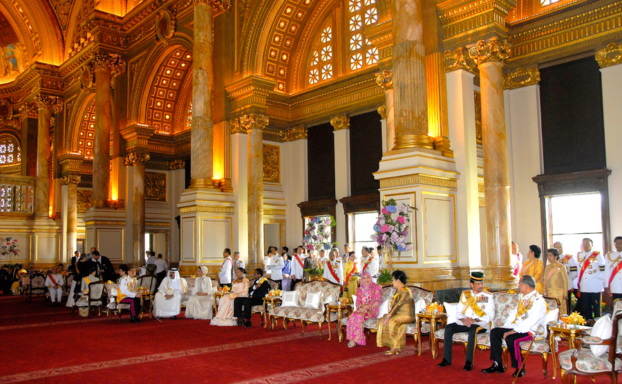 6) Die königlichen Schuhe, auf Thai: Chalong Phra Bat. Die Schuhe sind aus feinstem Gold hergestellt, sie sind an den Zehen aufgestellt, um zu verhindern, daß der König den Boden berührt. Die Sohlen sind aus Goldblättern, die Oberfläche ist von Diamanten übersät, der Innenbereich der Schuhe besteht aus rotem Bast. Die Schuhe werden nur bei der Krönung benutzt und symbolisieren die Akzeptanz des Königs durch das Volk.