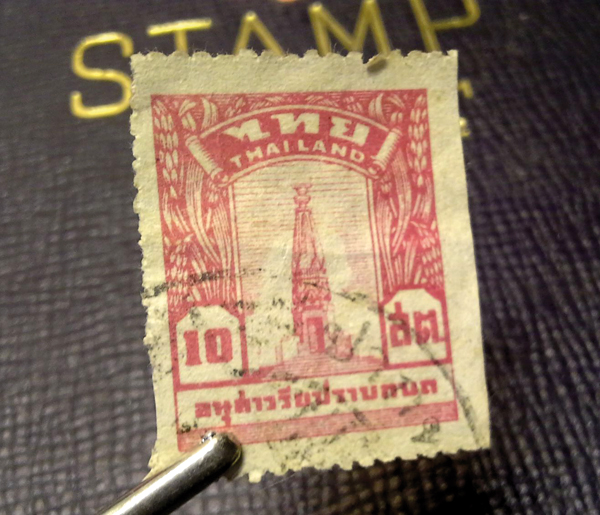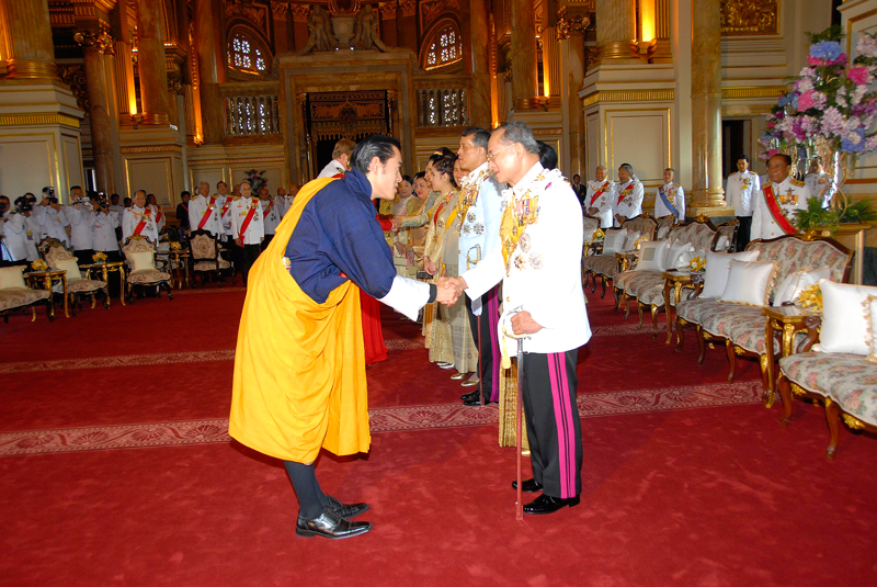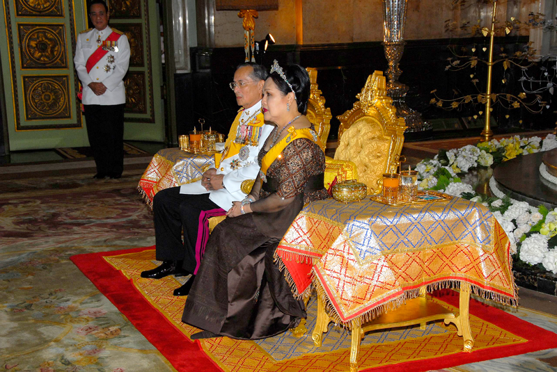 4) Der Königliche Stab, auf Thai: Than Phra Kon. Der Stab ist aus Kassiaholz (Cassia fistula) und an beiden Enden mit Gold verziert, er hat eine Länge von 118 cm. Ein Ende hat einen Knopf und und am Fussende befinden sich drei Zacken. Der Stab wird in Thailand mit der Justiz assoziiert, indem man sagt, daß der König den Pfad der Justiz und Billigkeit beschreitet.