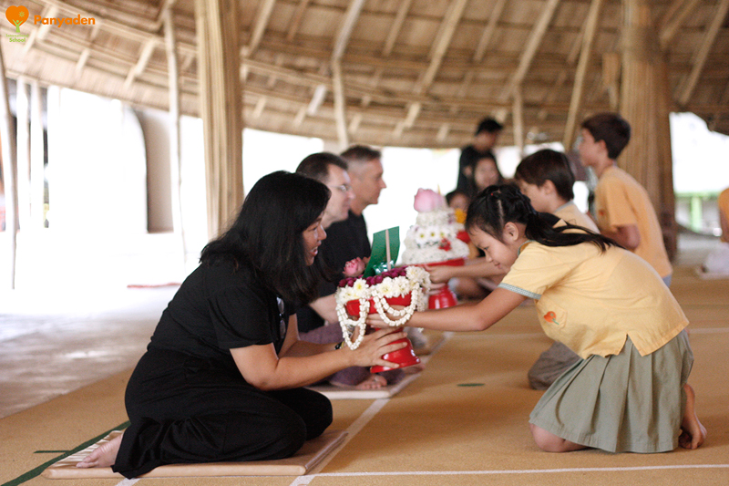 Dann übergeben die Schüler ihren Lehrern und Lehrerinnen, die auf Stühlen sitzen, die Blumengebinde, indem sie vor ihnen knien und die Blumengebinde mit einem Wai übergeben. Jeder Lehrer und jede Lehrerin nimmt sich immer etwas Zeit für jeden einzelnen Schüler bei der Übergabe der Blumengebinde, spricht aufmunternde Worte, streichelt fürsorgevoll den Kopf oder hält die Hand dabei. Dies symbolisiert eine Art Segen der Lehrer für jeden einzelnen Schüler.