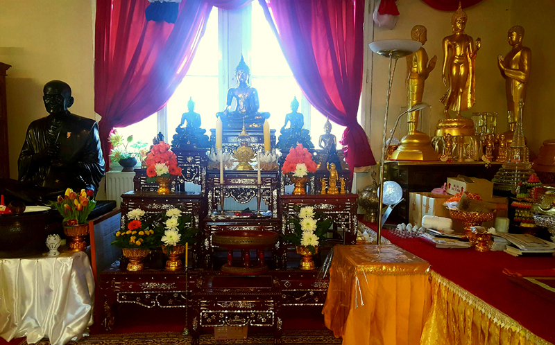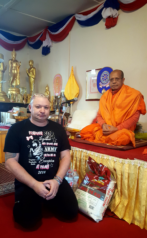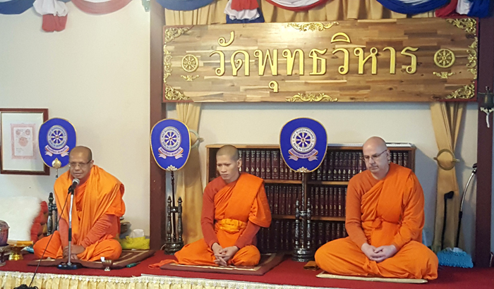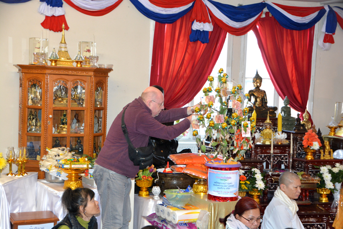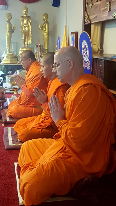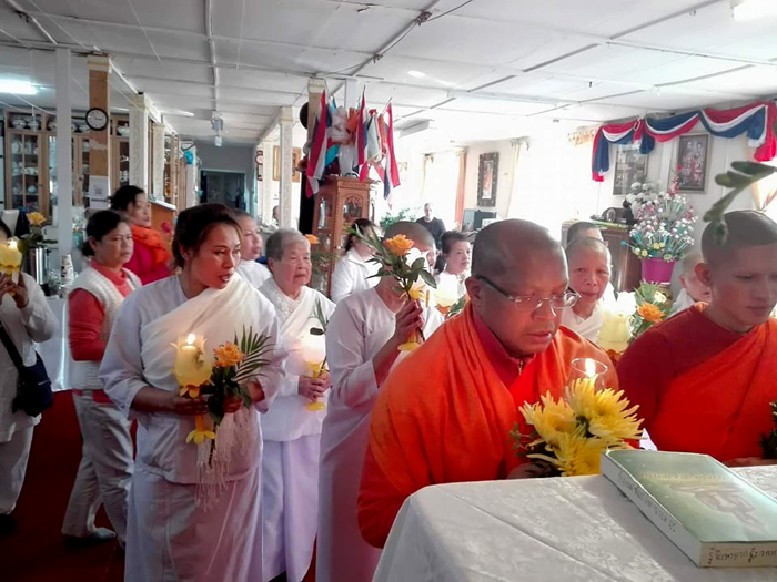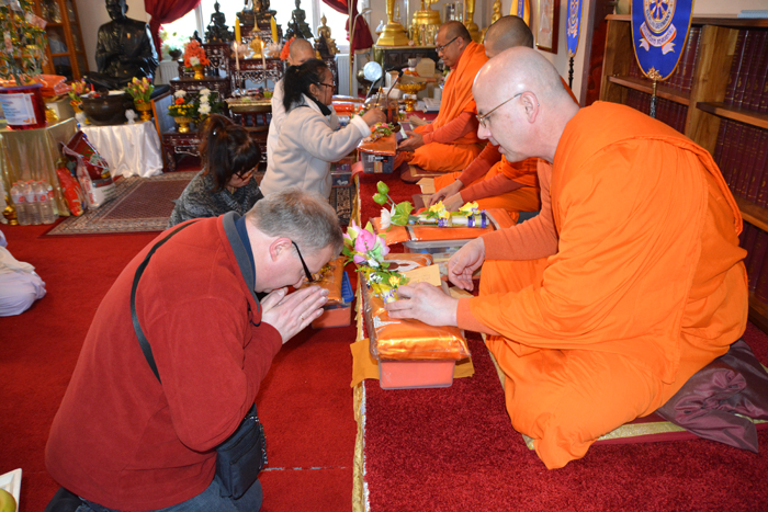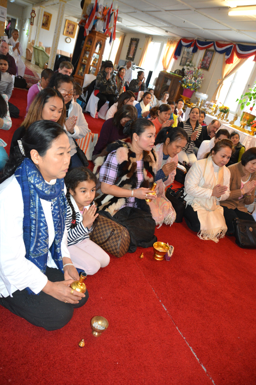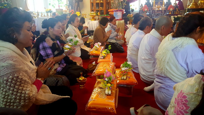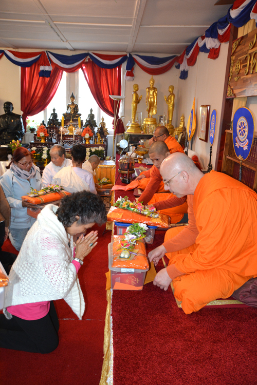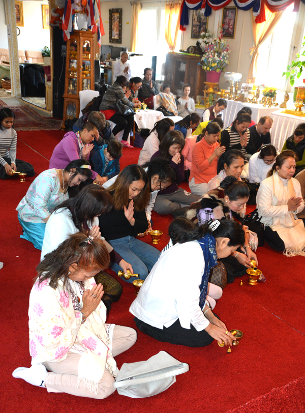 Nach der Predigt erfolgt ein gemeinsames Gebet, und während alle noch beten, wird eine Kerze angezündet, und der Mönch lässt einige Tropfen des Kerzenwachses in eine mit Wasser gefüllte hohe Schale tropfen. Auf dem Wasser in der Schale schwimmen Blütenblätter der Aubergineblume. Dadurch wird das Wasser vom Mönch symbolisch gesegnet. Man nennt dieses Wasser nam mon.