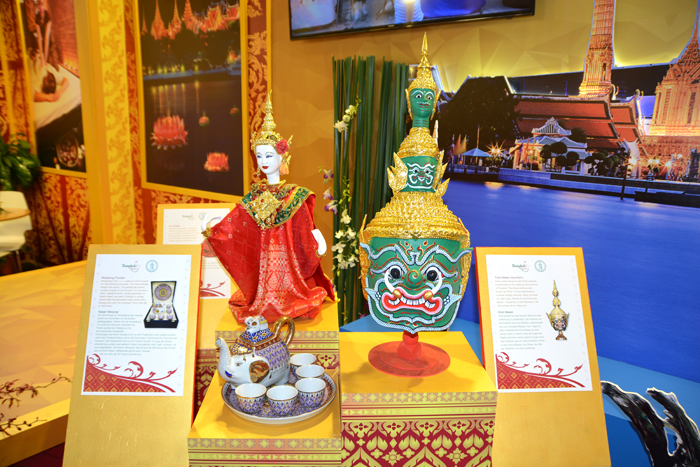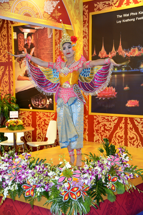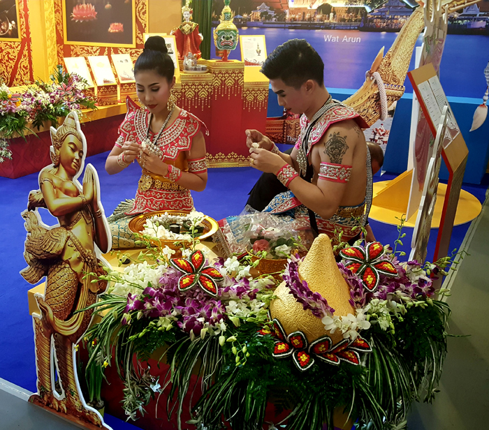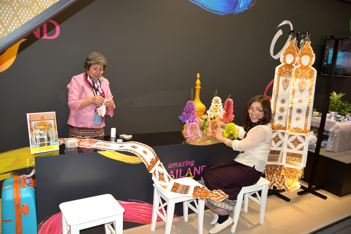 Auf dem weiteren Rundgang durch die Halle findet man Präsentationen vieler Destinationen und touristischer Hotspots wie etwa Ko Samui und Bangkok, dann thailändisches Kunsthandwerk in allen Variationen, Infostände von Reisebüros, Hotelketten, leckeres Thai-Food und Thaimassage, das Obst-Schnitzen live - also alles was das Herz begehrt.