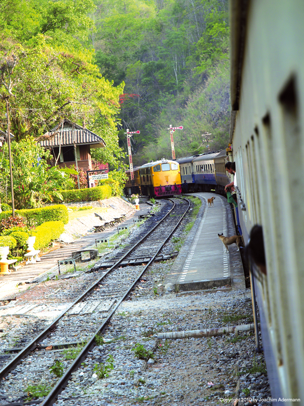 "Nicht, dass wir den Zug verpassen," sagte sie. Die Suppe kam bald - ein einfahrender Zug aber auch. Mu verlor ihre sonst so ausgeprägte thailändische Gelassenheit: "Ich flitze mal schnell zum Bahnhof rüber und schaue nach, ob es nicht doch unser Zug ist." Er war es! Die vorherigen Züge waren ausgefallen.
