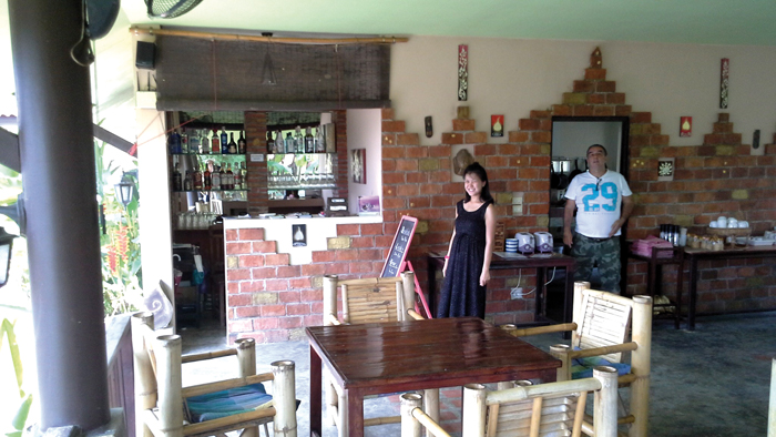 Das kleine Restaurant bietet neben den üblichen Thaigerichten auch eine Auswahl an europäischen Speisen an, alles zu sehr moderaten Preisen. Da Alkohol in Thailand sehr hoch besteuert wird, kosten Cocktails das gleiche wie ein Thai-Essen, aber in Euro umgerechnet ist alles immer noch sehr preiswert. So bezahlt man für ein kleines Bier etwa 2 Euro, das wird von den freundlichen, aber vollständig bekleideten Damen auch gern an den Pool gebracht, damit man diesen bei der Hitze gar nicht erst verlassen muß. Der ist leider nicht so groß, wie er auf den Bildern erscheint, reicht aber zum Abkühlen allemal.