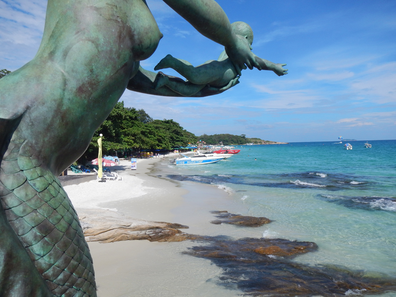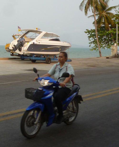 Am nächsten Morgen fühlte ich mich trotz der harten Betten ausgeruht und frühstückte auf der Terrasse, um das schon rege Treiben am Strand beobachten zu können. Sehr tiefliegende Kutter kamen vom Festland und versorgten die Hotels mit Trinkwasser. Aber auch die Vorbereitungen für Jetskis, Bananenboote usw. waren schon im Gange. Einige Trupps von Chinesen, die kuriose Verrenkungen und Sprünge für ihre Fotos aufführten, waren auch schon auf den Beinen. Ansonsten fiel mir am Tag zuvor schon auf, dass die Insel relativ leer war und nicht nur auf Samet auch auf dem Festland wimmelte es nicht gerade von Urlaubern. Russen kamen nur noch wenige und die anderen Farangs suchten sich wohl schon andere preiswertere Urlaubsdestinationen.