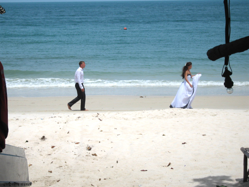 Ich machte es mir auf einer Liege am Strand gemütlich und nahm die Bucht in Augenschein. In einiger Entfernung entdeckte ich zwei Gestalten, die irgendwie seltsam aussahen. Ich wusste noch nicht, aber etwas irritierte mich an den beiden. Als sie näher kamen wusste ich was nicht passte, das Pärchen war in voller Hochzeitsgarderobe am Strand unterwegs, vermutlich auf der Suche nach dem perfekten Foto für das Familienalbum. Ich konnte ein paar Brocken Russisch aufschnappen als sie an mir vorbeiflanierten. Alles klar, dachte ich: Tink tong mak mak! Das nächste Ziel meiner Tour war die Südspitze der Insel, wo die beiden Küsten aufeinandertreffen und sich die Naturparkverwaltung befindet.