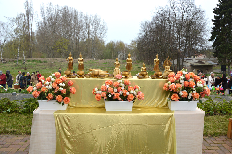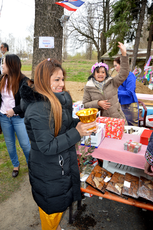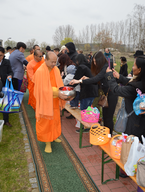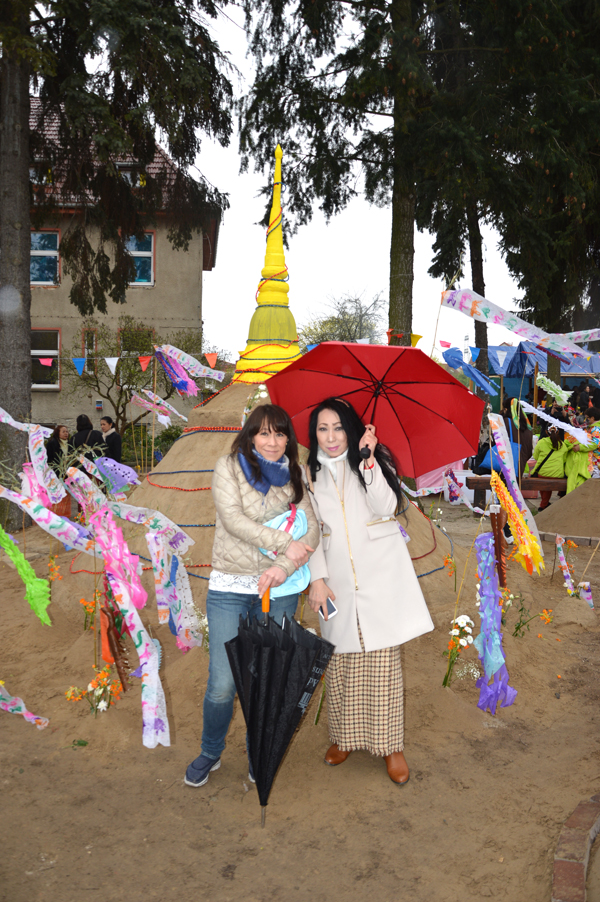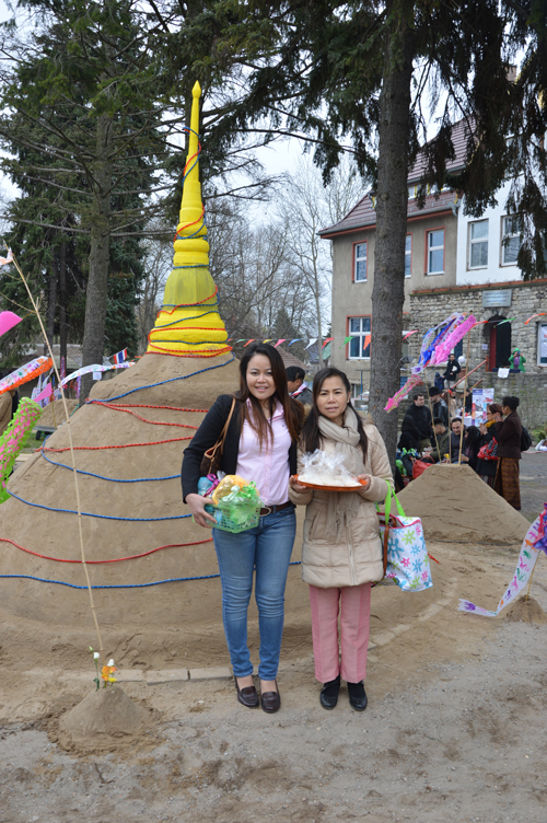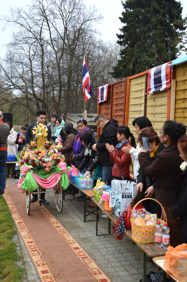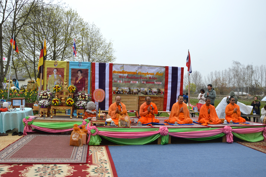 Um all diese Traditionen gemeinsam zu feiern wurde dieses Jahr das Songkran-Fest am Sonntag, den 10. April, im Berliner Wat Buddhavihara gefeiert. Die Zeremonien fanden diesmal - trotzt recht unfreundlichen Wetters - im Freien statt. Die Bühne stand mitten auf dem Tempel Gelände vor dem Haupthaus, dazwischen waren 3 Chedis aus Sand mit Goldenen Spitzen und bunten Bänder errichtet worden. Gegen 10 Uhr begann die Zeremonie mit einem gemeinsamen Gebet. Der große Gabenzug (wobei den Mönche viele Geschenke gereicht wurden) verlief über das gesamte Gelände. Sehr viele Buddhisten waren gekommen um den Mönchen ihren Respekt zu erweisen und für ihre Familien Segen zu erbitten. An allen Ecken konnte man sich, von all den leckeren thailändischen Speisen seinen Gaumen verwöhnen lassen - man weiß nicht was man(n) zuerst essen soll. Händler aus Nah und Fern waren gekommen um ihre traditionellen und zumeist farbenfrohen Waren aus Thailand an den Mann (oder die Frau) zu bringen.
