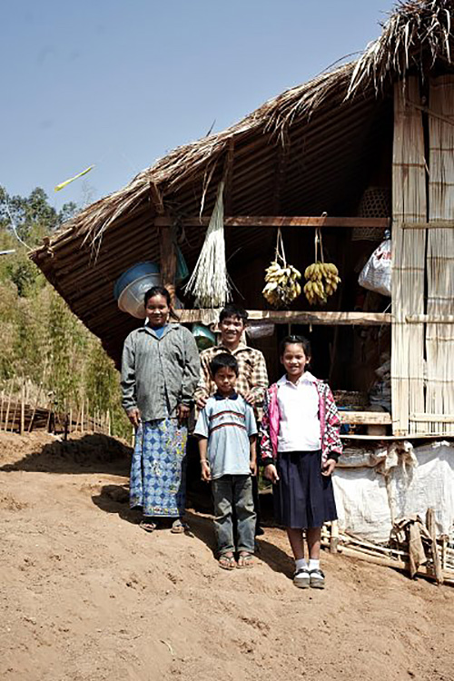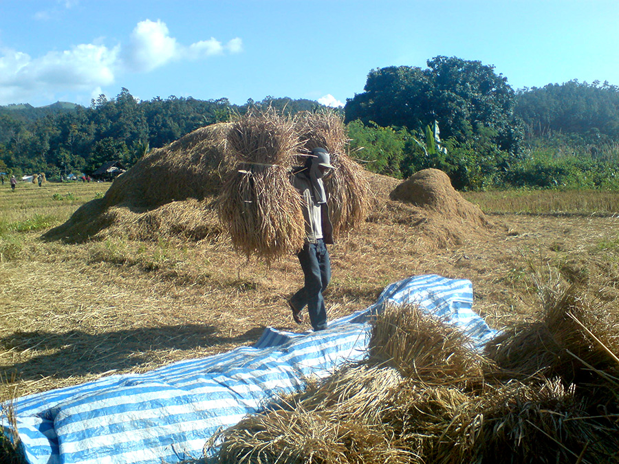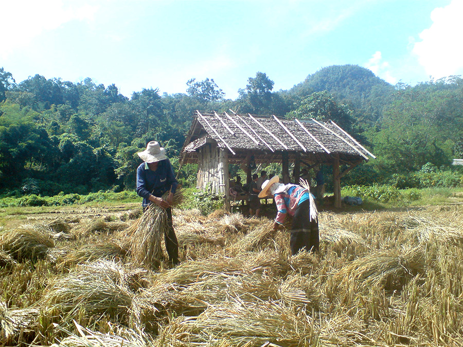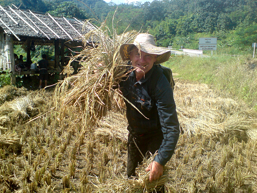 Am nächsten Tag besuchte er ein solches Dorf. Den Weg dorthin hatte der Mann gut beschrieben. Die Menschen gehören zum Bergstamm Lahu und sie wohnen in Pfostenhäusern. Neugierig umringte ihn eine nackte Kinderschar. Ein Mann kam auf einem Motorrad hinzu. Er konnte Englisch und erklärte, dass er gerade zu einem Reisfeld unterwegs sei. Fredy könne bei der Reisernte helfen, sagte er. Das ließ dieser sich nicht zweimal sagen. So lernt man Land und Leute kennen. Einige Kilometer entfernt hielten sie.