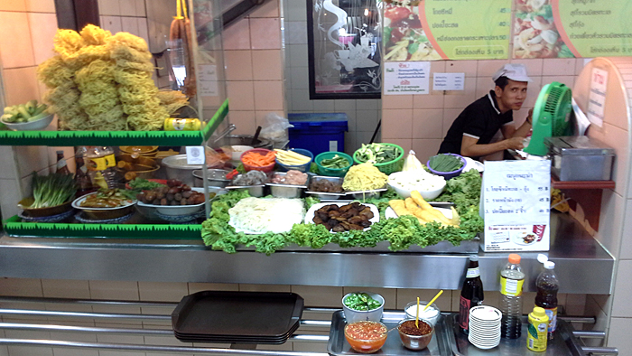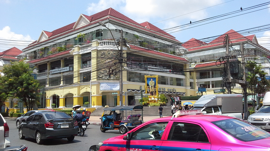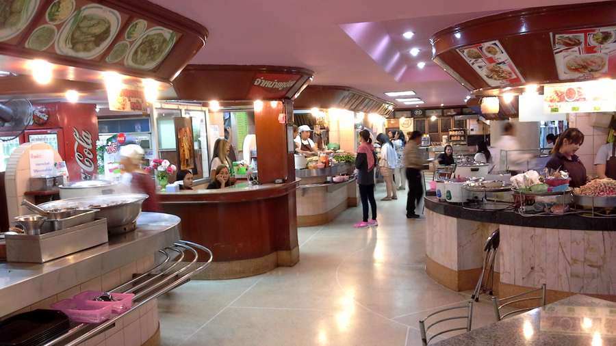 Wem nicht nach Nudelsuppe ist, der geht wieder an den Kreisel, nimmt ein Tuk-Tuk und läßt sich in wenigen Minuten ans Ende der Yaowarath-Strasse fahren. Dort steht das älteste Kaufhaus Bangkoks, das erst kürzlich sehr schön renovierte Old Siam Plaza. In der obersten Etage gibt es einen "food court", wo man ausgezeichnet für wenig Geld essen kann. Alles sieht sehr sauber und appetitlich aus, man kauft sich eine Guthabenkarte am Eingang, geht dann von Stand zu Stand und sucht sich die Speisen und Getränke aus. An einem Fensterplatz kann man dann beim Essen dem Treiben auf der Strasse zuschauen. Das Old Siam Plaza ist größtenteils klimatisiert, aber nicht so sehr, daß man eine Jacke mitnehmen muß. Wer auf dem Weg nach draußen wieder Hunger bekommt, kann sich im Erdgeschoß noch mit einer Kleinigkeit für den Heimweg versorgen.