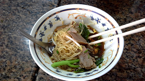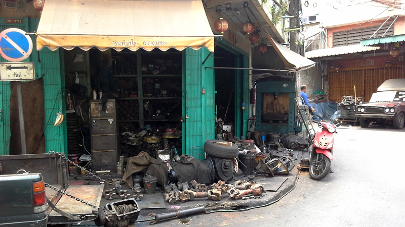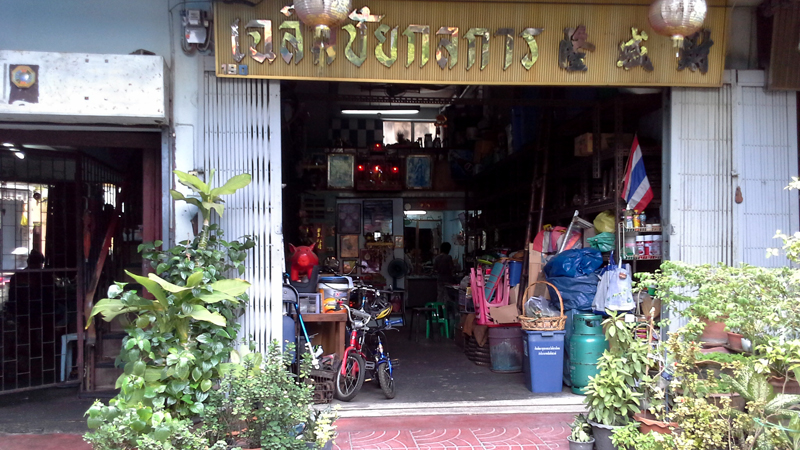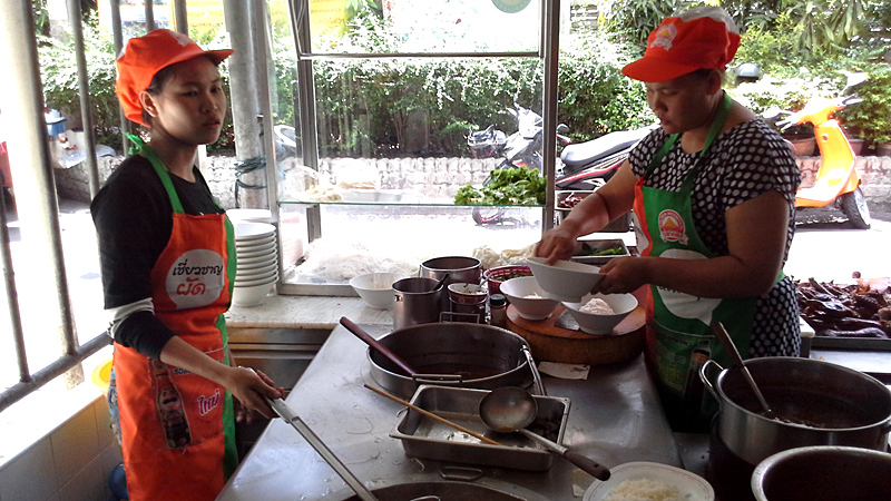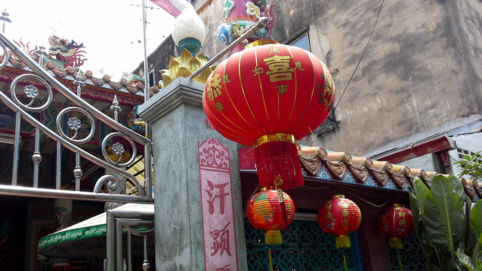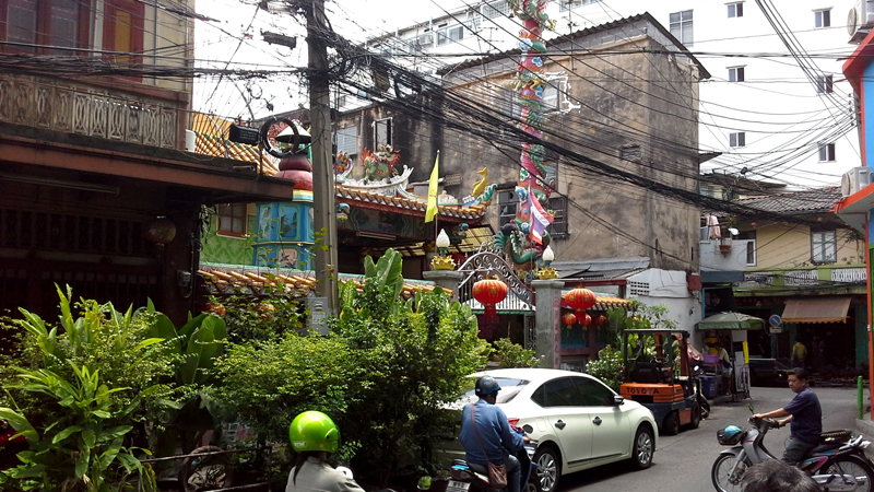 Wir wenden uns darum in die andere Richtung, in das Gewirr der kleinen Gassen zwischen dem Kreisel und dem Fluß. Denkt man sich die Autos weg, könnte man meinen, die Zeit sei stehen geblieben. Winzige Läden, die ihre Waren auf dem Gehsteig verstreut haben, man weiß eigentlich nicht genau, was die überhaupt verkaufen, dazwischen eingeklemmt chinesische Tempel mit den typischen roten Laternen, dann wieder eine Garküche. Letztere oft sogar mit einem Zertifikat der Stadtverwaltung, daß der Laden geprüft und für gut befunden wurde. Angestellte aus den umliegenden Behörden essen hier preiswert zu Mittag, und auch als Farang kann man hier unbedenklich eine Suppe bestellen.
