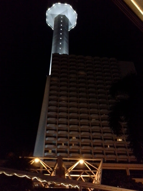 Pattaya Park Tower. Der Pattaya Park Tower erhebt sich rund 240 Meter über die Stadt und bietet allerlei Unterhaltung, so kann man sich an einer Seilrutsche aus dem 55. Stockwerk schwungvoll herabgleiten lassen und eine bessere Aussicht genießen als im Fahrstuhl. Wir haben uns aber für letzteren entschieden, für die Auffahrt und auch wieder runter. Wir waren eingeladen ins Meridian Revolving Restaurant mit dem International Buffet. Die Tische mit den Sitzplätzen drehen sich einmal in der Stunde um den inneren Turm mit dem Buffet. Nach jedem Gang muß man sich also neu orientieren, wo denn was ist: Vorspeisen - Hauptgerichte - Nachspeisen. Unser erster Eindruck: Es ist kalt und die Panoramascheiben müssten mal wieder geputzt werden.