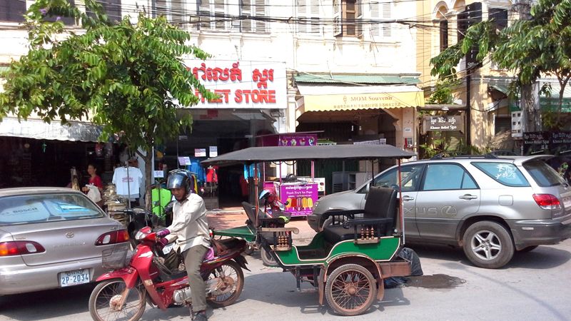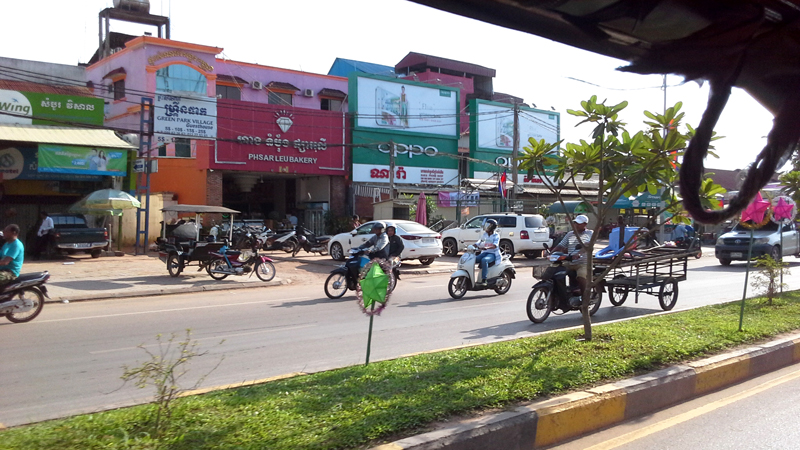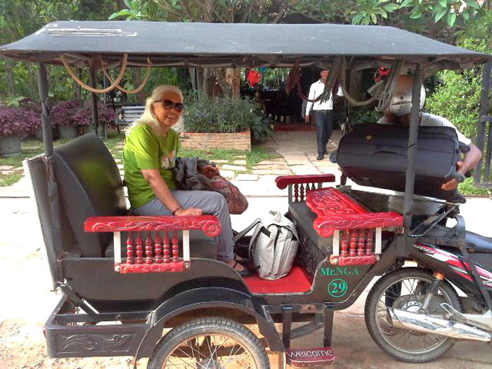 Der Fahrer, der uns zum Hotel bringen soll, ist pünktlich da, aber mit was für einem Gefährt? Kein klimatisiertes Taxi, sondern die kambodschanische Version eines Tuk-Tuks: Ein Motorrad mit einem einachsigen Hänger, auf dem zwei Sitzbänke montiert sind und ein Sonnendach darüber. Es sitzt sich recht bequem und Platz für zwei große Koffer ist auch.