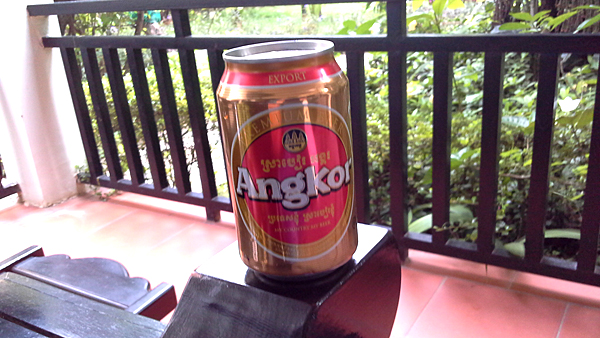 Der Kühlschrank ist gut gefüllt: Angkor Dosenbier bis zum Anschlag, und etwas Wasser für Notfälle. Auf der Terrasse vor dem Bungalow läßt es sich beim Bier gut sitzen und von der Anreise erholen.