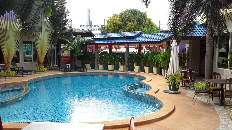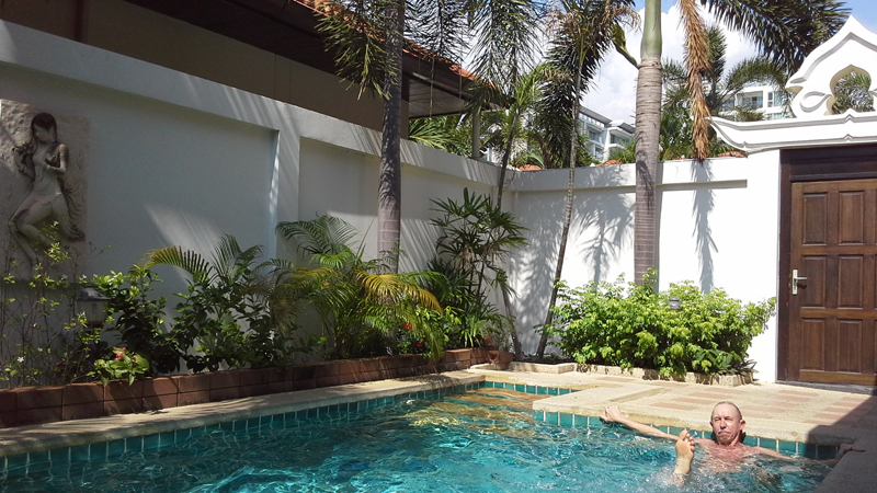 Als erstes haben wir bei Dasiri einen Bungalow mit Pool gebucht, klein aber fein, in einer Anlage namens Majestic Residence in Pattaya. Die liegt etwas versteckt hinter dem Hügel des bekannten Wat Khao Phra Bat im südlichen Teil Pattayas. Oben auf dem Hügel neben der Polizeistation parken täglich die großen Reisebusse, natürlich mit laufenden Motoren. Da muß man abbiegen und die Strasse vom Hügel herunter fahren, ist leider nicht weiter ausgeschildert.