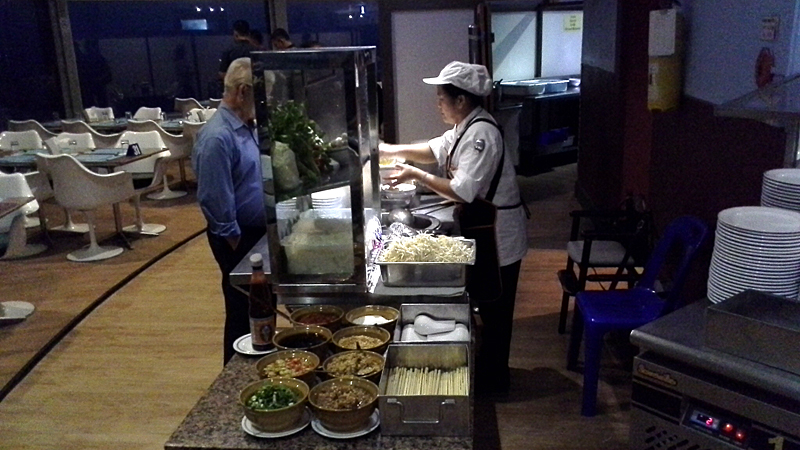 Wer gerne einen Sonnenuntergang aus luftiger Höhe genießt, ist hier richtig, und wer ein Buffet voll auskosten möchte, auch. Wie an den meisten Buffets, ich nehme mal das vegetarische Restaurant Khun Churn ausdrücklich hiervon aus, geht es eher um Quantität als um Qualität. Meiner Meinung nach steht allerdings der Preis von 600 Baht für Eintritt und Buffet in keinem Verhältnis zur Leistung. Das Essen ist zwar reichlich und bietet von allem, ist aber geschmacklich doch weit unten angesiedelt. Außer dem Wasser müssen alle Getränke extra bezahlt werden, was besonders bei Alkoholika den Preis in die Höhe treibt.