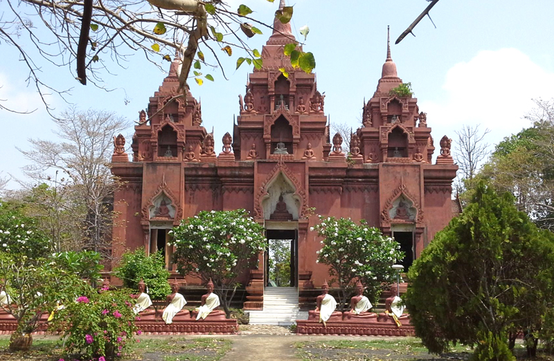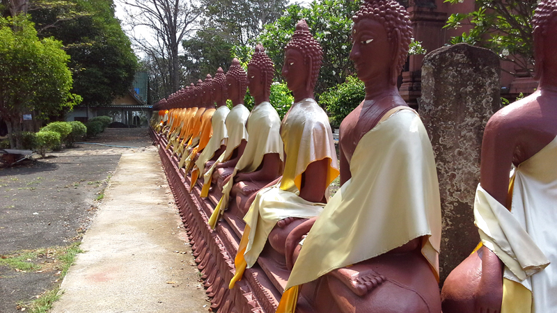 Die Tempelanlage von Khao Angkhan mit dem liegenden Buddha. Ein Ort der Ruhe, das ist das Erste, was einem einfällt. Der Isaan, also Nordosten von Thailand, war in der wechselvollen Geschichte mal von den Khmern beherrscht, mal von den Siamesen. Die Khmer haben überwiegend in Sandstein gebaut, weswegen ihre Bauwerke die Zeit besser überdauert haben als die Ziegelbauwerke der Siamesen. In Khao Angkhan hat man seit dem 9. Jahrhundert alles auf- und angebaut: zuerst die hinduistischen Tempel der Dvaravati-Periode von denen nur noch die Grundmauern erhalten sind, darauf wurden buddhistische Tempel gebaut, und ganz neu sind Anlagen im Khmer-Stil, beeindruckend umrahmt von sitzenden Buddhafiguren. Daneben gibt es einen kleineren Tempel im chinesischen Stil und natürlich den großen liegenden Buddha im Außenbereich. Er ist "nur" 29 Meter lang, 16 Meter weniger als der berühmte liegende Buddha im Wat Pho von Bangkok. Anders als dieser ist der Buddha aber nicht in der Parinirvana-Stellung dargestellt, also liegend, den Kopf mit einer Hand stützend, sondern beide Arme am Körper ausgestreckt, eine recht seltene Darstellung.
