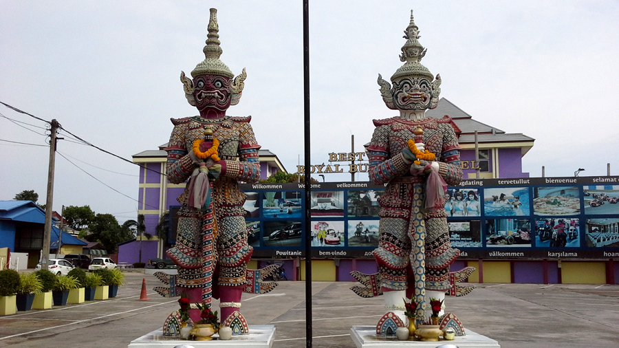 Buri Ram empfängt uns, wie es sich für den Namen gehört, mit lustigen Figuren unter dem Stationsschild. Buri heißt Stadt und ram steht für charmant oder reizvoll. Unser Hotel hat einen Fahrer geschickt, der ist aber wieder zurückgefahren, weil unser Zug Verspätung hat. Wir rufen ihn an und wenig später sind wir unterwegs ins Best Western Royal Buriram. Das sagt eigentlich niemand, sondern man nennt es Yak Hotel, wegen der großen Yaks, die vorne Wache halten.