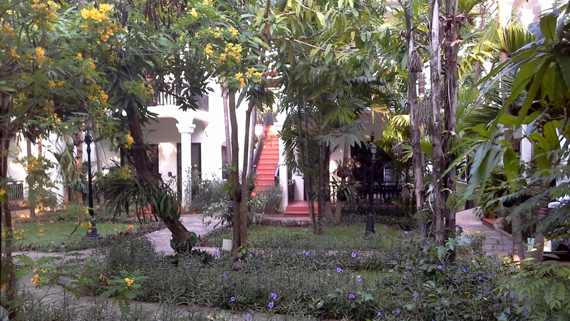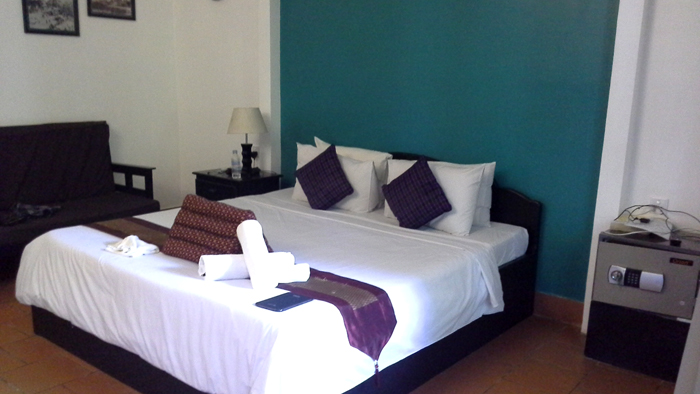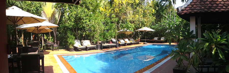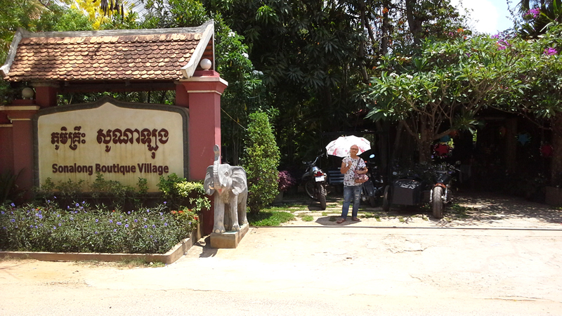 Unser Hotel ist das Sonalong Village, ein kleineres Haus in der Altstadt, nicht weit vom zentralen Marktplatz. Es liegt in einer Seitenstrasse sehr ruhig, um einen urwaldähnlichen Garten sind Bungalows im Kolonialstil gruppiert. Die Zimmer sind natürlich klimatisiert, das Restaurant dagegen nach allen Seiten offen. Das Frühstück, als "american breakfast" ist ausreichend, wenn man "continental" bestellt gibt es zwei Scheiben Toast mit quitschsüßer Konfitüre. Da wäre noch etwas Luft nach oben für Verbesserungen.