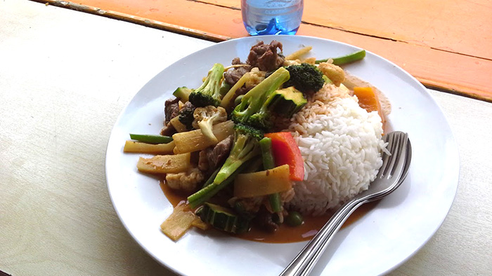 Sofern das Fenster wie auf dem Bild bei gutem Wetter geöffnet ist, riecht man schon draußen, was gerade gekocht wird. Und gekocht, genauer gesagt im Wok gebraten, wird tatsächlich jedes Gericht auf Bestellung frisch. Da gibt es nur einen riesigen Reiskocher und sonst nichts auf Vorrat, keine Edelstahlschüsseln, in denen das Essen stundenlang warmgehalten wird. Frisches Gemüse aus dem Wok ist knackig, wie es sich gehört.