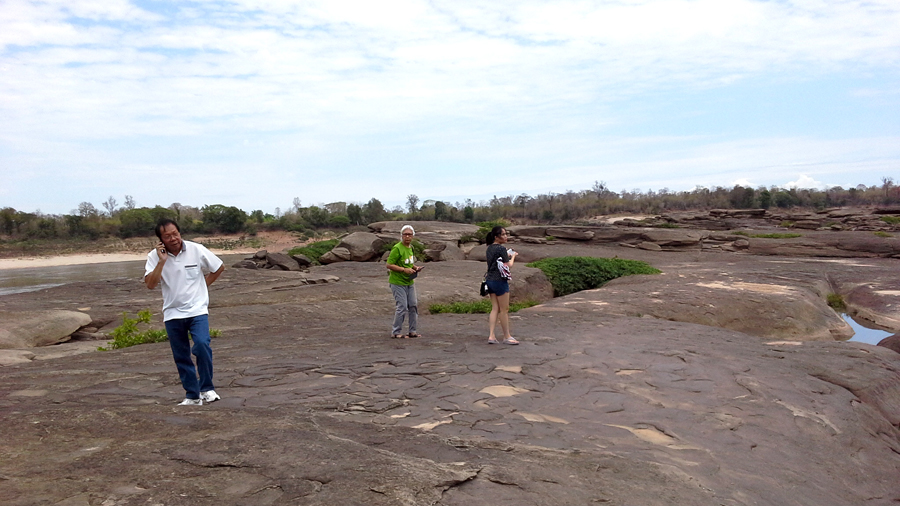 Die 3.000 Löcher, Sam pan bok, man hat es auf den großen Stein nochmal zur Sicherheit angeschrieben, beziehen sich auf den Sandstein, der hier über mehrere Kilometer den Grund eines Seitenarmes des Mekhong bildet. In der Trockenzeit, und nur dann, führt der Fluß so wenig Wasser, daß der Grund zu sehen ist und man darauf entlanggehen kann.