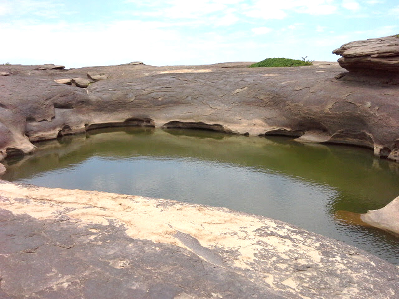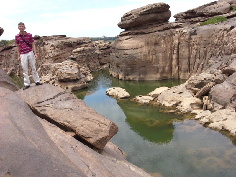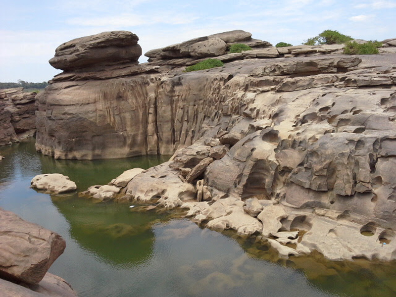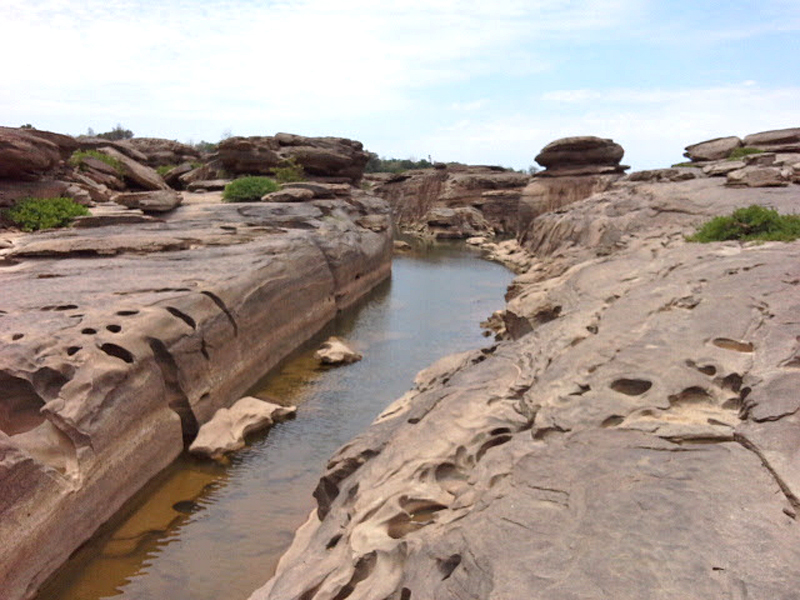 An anderer Stelle hat der Fluß richtige Canyons in den weichen Stein gegraben, die mit Weitwinkeloptik fotografiert sehr beeindruckend aussehen. Hat man sich mit dem Boot aber erst mal übersetzen lassen, relativiert sich die Größe doch sehr schnell. Grand Canyon Thailand klingt natürlich besser als Mini Canyon. Die Felsenformationen können nur während der Trockenzeit, etwa von Dezember bis April, besichtigt werden, dann werden sie wieder vom Wasser überdeckt. Das ist aber auch das Problem für den Besucher, denn spätestens ab Mittag wird es unerträglich heiß auf den die Hitze reflektierenden Felsen. Zudem ist die Gegend zwei Fahrstunden von Ubon Ratchathani entfernt, so daß man sich sinnvollerweise recht früh morgens auf den Weg machen muß.
