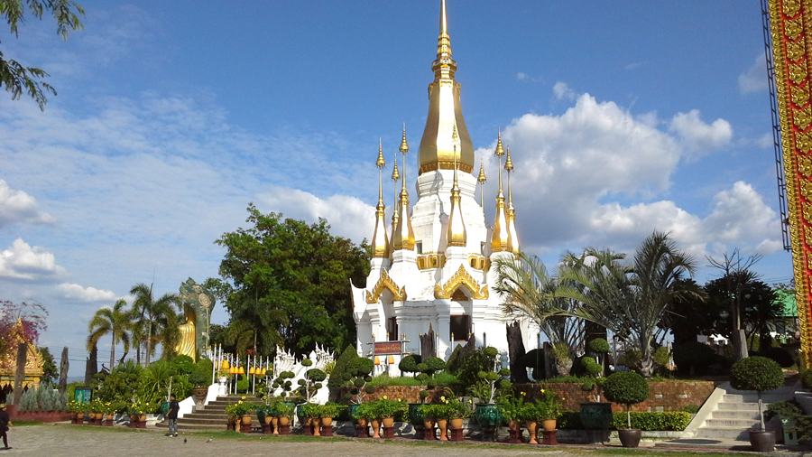 Weiter geht es von Buriram in den Nordosten, Richtung Laos. Wir fahren mit der Bahn nach Ubon Ratchathani, meistens nur kurz Ubon genannt. Der volle Name bedeutet etwa: königliche Stadt der Lotosblüten. Ubon liegt in einem Dreiländereck von Laos, Cambodia und Thailand. Es wird erwartet, dass sich die angrenzenden Staaten in den kommenden Jahren mehr und mehr öffnen und Ubon eine bedeutende Rolle in diesem Wirtschaftsraum spielen wird. Geschäftsleute aus der ASEAN-Region haben schon mal einen Anfang gemacht und dem Wat Tham Kuha Sawan in dem Flecken Khong Chiam an der Grenze zu Laos einen Gong gestiftet - vermutlich den größten der Welt! Wenn schon Business, dann aber richtig.