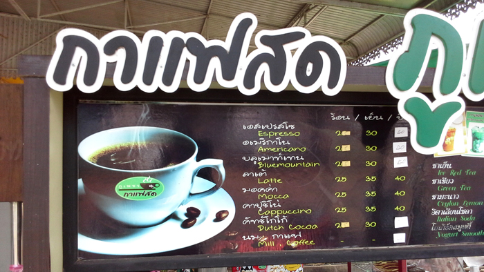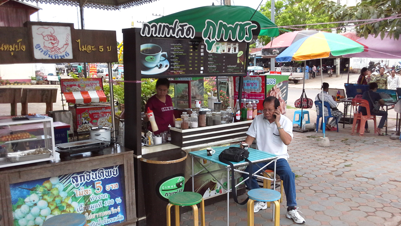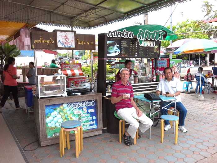 Womit wir endlich bei den 3.000 Löchern wären, jedenfalls nach einer weiteren halben Stunde Autofahrt, den Mekhong stromaufwärts. Vorher machen wir aber noch eine kurze Kaffeepause an einer kleinen Bude: Leider gibt es nur Pappbecher, was sicher der Hygiene zuträglich sein mag, den Genuß deutlich schmälert. Wenn ich eine Nudelsuppe an der Strasse esse, schaue ich ja auch lieber nicht, wo die Teller gespült werden, Hauptsache, die Suppe schmeckt.
