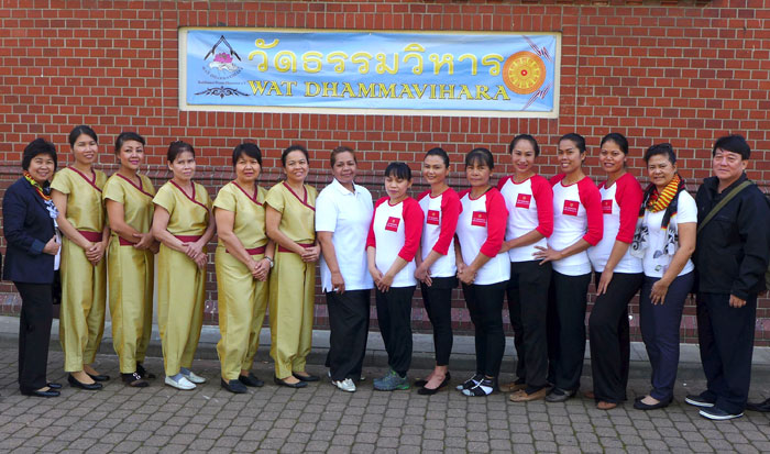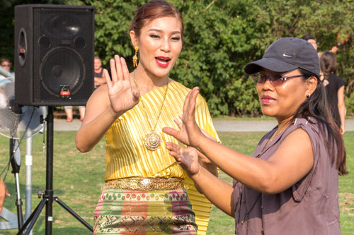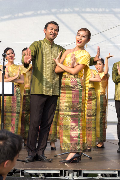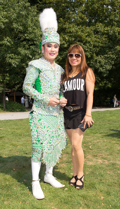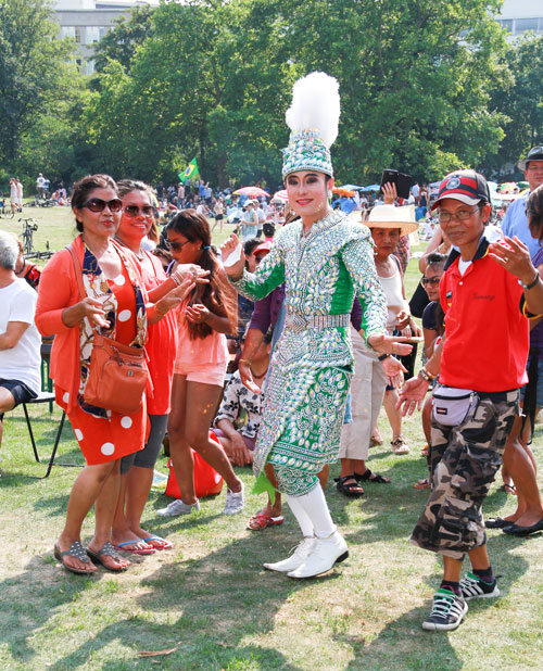 SUANPLU CHORUS hat bereits an vielen internationalen Wettbeweben teilgenommen und zahlreiche Preise errungen. Der Chor bot nicht nur viele traditionelle Lieder, auch einige Tanzdarbietungen und mehrere instrumentale Vorträge einzelner Künstler. Schon im Vorprogramm wurde gute Stimmung von Berliner Thais gemacht. Darunter Toi in seinem glitzernden Likee Kostüm, das in der Sonne nur so funkelte. Das wollten viele Gäste natürlich fotografieren. Weiterhin gab es eine Thaimassage für die Gäste und einen Info-Stand mit nützlichen Broschüren für den nächsten Thailand-Urlaub. Auch das leckere Singha-Bier wurde gratis angeboten - und war bei der Hitze natürlich schnell an den Mann gebracht. M. Heinrich