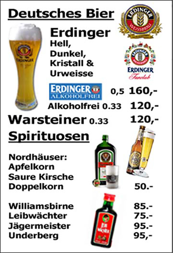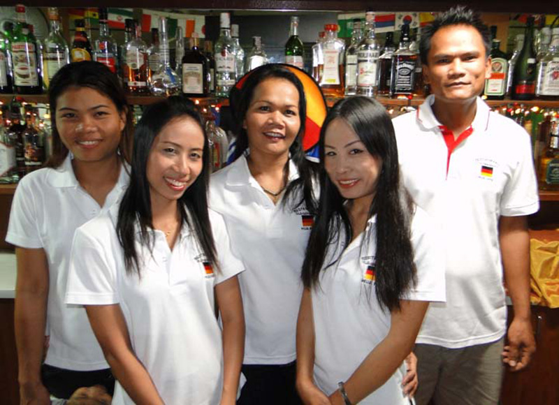Ich, Theo, und mein Team sorgen für das leibliche Wohl der hier lebenden Ausländer und Urlauber. Typische deutsche Gerichte und auch deutsche Biere (Erdinger, Warsteiner) sowie Spirituosen (Jägermeister, Nordhäuser, Obstler) gehören zu unserem Angebot. Kotelett, Rouladen und Bratwürste mit Sauerkraut sind nur einige unserer Spezialitäten. Viele unserer Gäste mögen das herzhafte und reichliche Essen. Mein Personal und ich laden Euch herzlich ein sich davon zu überzeugen. Schauen Sie bei uns rein !!!