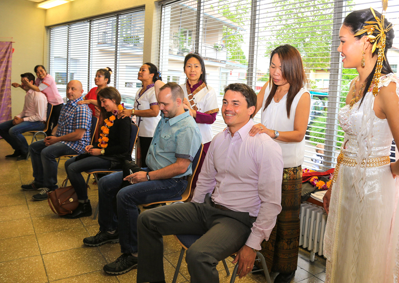 Nicht nur Bürgermeister Matthias Gutbrod kam zur fünften Auflage des thailändischen Food- und Kulturfestivals in der Festhalle, sondern nahezu alle Gemeinderätinnen und Gemeinderäte der 5.000 Einwohner-Gemeinde im Ortenaukreis in Baden-Württemberg feierten mit. Alle Ehrengäste wurden mit einer Blumenkette von den Mönchen des Wat Dhammakaya Schwarzwald, der als Veranstalter auftritt, empfangen. Später wurde die thailändische Nationalhymne gesungen. Der Tempel und die Mönche sind in Kippenheim offenbar sehr gut integriert.
