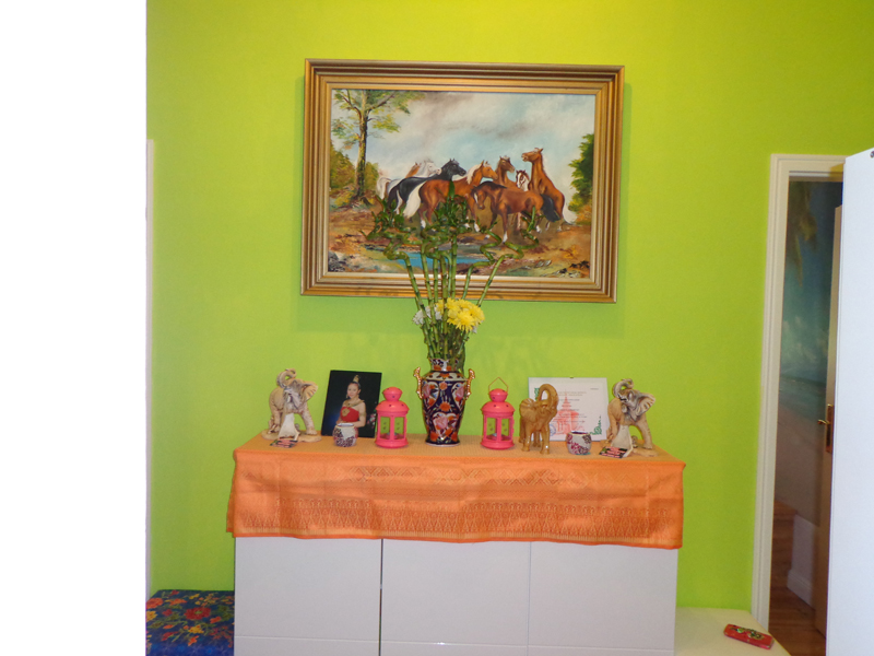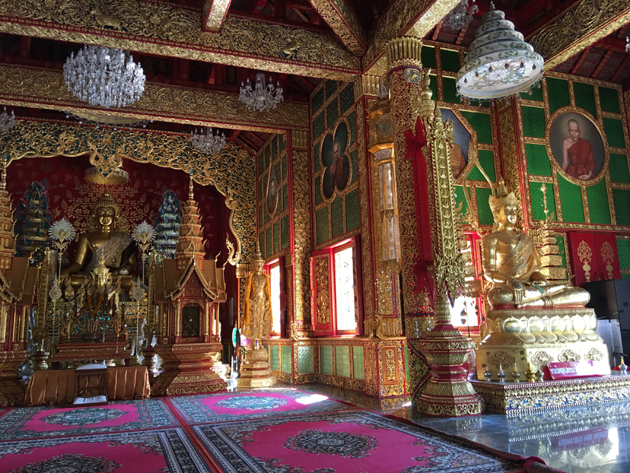 Da der Tempel noch nicht ganz fertiggestellt ist und noch nicht alle Feiern zur Einweihung begangen wurden, hängen die acht goldenen Kugeln (Luk Nimit) der Grundsteinlegungszeremonie noch an den Seilen und sind noch nicht in die dafür vorgesehenen Schächte eingelassen. Nur die neunte Kugel, über deren Schacht im Inneren des buddhistischen Tempels die Hauptbuddhafigur platziert wird, ist schon an ihrem endgültigen Platz. Auf die anderen bringen auch wir noch unser Blattgold auf und verbinden damit unsere guten Wünsche für die Menschen, die diesen Tempel in Zukunft aufsuchen werden. Später werden über den in den Boden eingelassenen Kugeln die Bai Sema-Steine errichtet, die in unseren Tempeln die Grenzen des geweihten Bereiches markieren. Doppelte Bai Sema-Steine zeigen, dass es sich bei dem Tempel um einen Wiederaufbau handelt. Gar dreifache zeigen, dass es sich um einen Tempel der königlichen Klasse handelt. Wir genießen noch für einen stillen, zweisamen Moment die prächtige Innenausstattung des Tempels und spazieren dann zurück zum Auto, wo meine Tochter ins Spiel mit meinen Schwestern so versunken ist, dass sie erst jetzt merkt, dass wir über eine Stunde weg waren.
