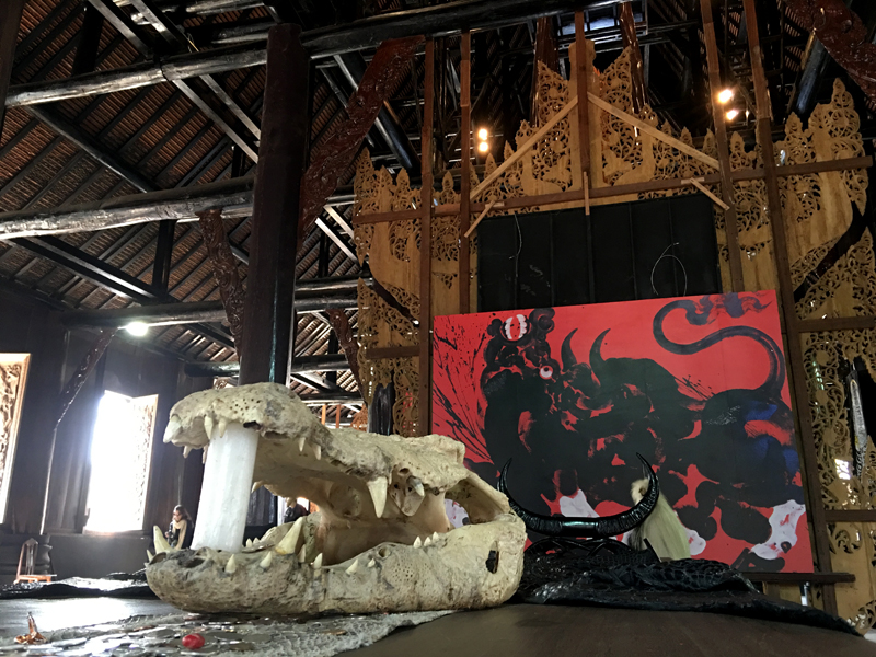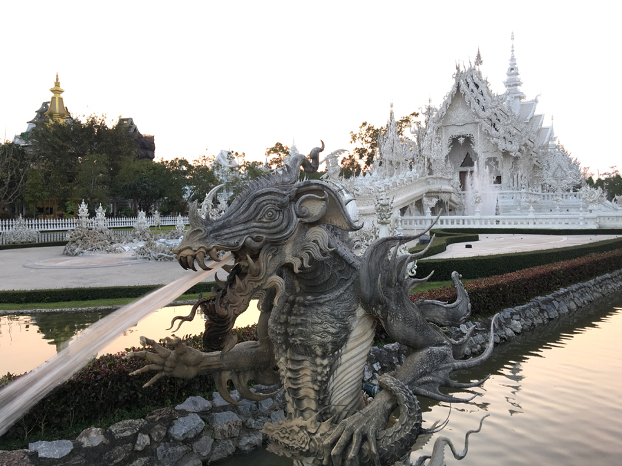 In Chiang Rai warten noch zwei Attraktionen auf uns: der Weiße Tempel Wat Rong Khun und das schwarze Haus Baan Dam. Nur scheinbar wirkt der Gegensatz von Weiß (weißer Tempel) und Schwarz (Baan Dam) wie konstruiert oder abgestimmt. Außer, dass Thawan Duchanee, ein Schüler des Tempelerbauers Chalermchai Kositpipat war, gibt es keine Verbindung. Dem einen ging es um Reinheit, Erkenntnis und Buddha, obwohl er in der Trauerfarbe Weiß arbeitete. Der andere beschäftigte sich mit der Vergänglichkeit, Mystik, Dämonen und dem Tod. Wir lassen uns auf beiden Arealen viel Zeit, versinken immer wieder in Details, nutzen aber auch schattige Plätze nur zum Verweilen und um mit meiner Tochter Mira zu spielen. Sie ist erst 18 Monate alt und zum zweiten Mal in Thailand. Um die vielen neuen Eindrücke zu verarbeiten, braucht sie Pausen und Zuwendung. Die bekommt sie von unserer ganzen familiären Reisegruppe.