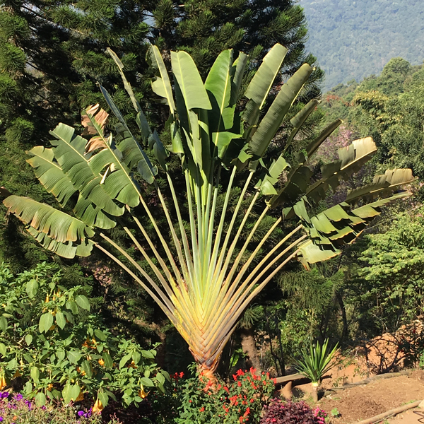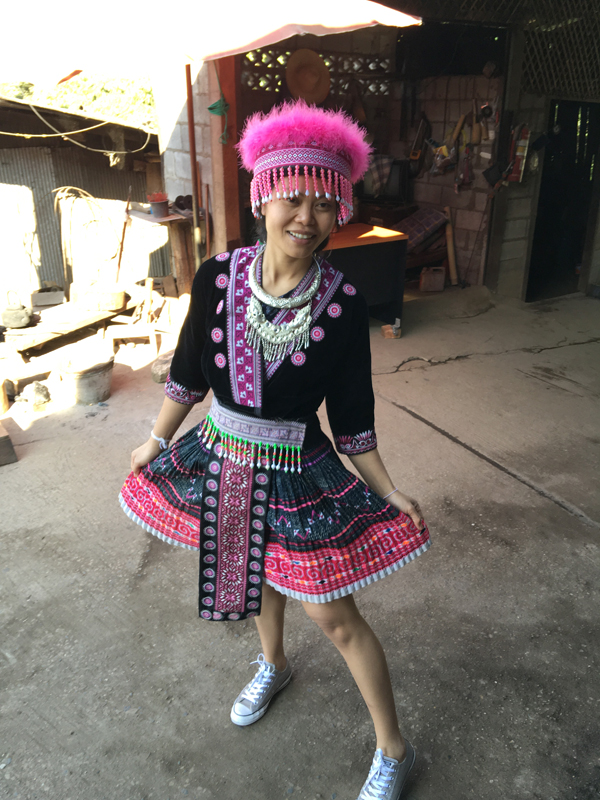 Heute weiß man, dass Militär und Geheimdienste beteiligt waren. Und später als die Drogen in die USA kamen und dort Menschen zerstört haben, wurde dann Thailand international unter Druck gesetzt, den Opiumanbau zu unterbinden. Stattdessen sollen die Menschen jetzt Blumen züchten (oder sich als Kulisse für Touristengruppen zu Affen machen lassen, die bestaunt und fotografiert werden). Da machen wir uns doch lieber selber zu Affen und ziehen die traditionelle Kleidung der Hmong bei unserem Spaziergang durch die Blumengärten an. Am meisten Spaß hatten wir an dem riesigen Bambus, der an einem Wasserfall bestens gewachsen ist (er mag über 20 Meter hoch gewesen sein) und an einer prächtigen Fächerpalme.