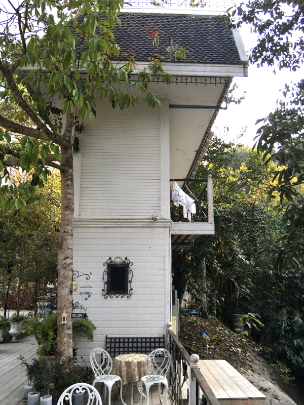Vor uns liegt der Rest der 762 Kurven auf der Strecke von Chiang Mai bis Pai. Unterwegs in den Bergen auf dem Highway 1095 nach Pai fallen wir kurz hinter einer Kurve auf ein wunderbares Beispiel für ein "Potemkinsches Dorf" rein: das Hotel Le Vintage. Es präsentiert sich mit einer für Thailand ungewöhnlichen Kolonialstil-Fassade, einer aufwändig gestalteten Auffahrt und einem schönen Café im Nebengebäude. Als wir reingehen und uns die Zimmer ansehen wollen stellt sich heraus, dass es keinen Eingang und keine Rezeption gibt. Dann gehen wir seitlich ums Haus herum, um nach einem Nebeneingang zu schauen. Das Haus ist nur 2 m tief und dahinter geht es einen steilen Abhang hinunter. Es dient nur als Kulisse, um Gäste für das Café anzuziehen und als Fotolocation. OK, hat bei uns geklappt. Wir trinken einen Kaffee, lachen über unsere eigene Leichtgläubigkeit und fahren dann weiter.
