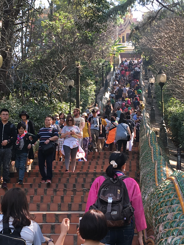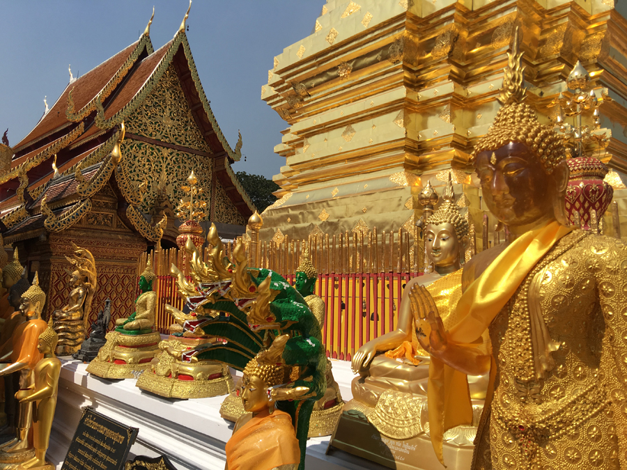 Eine letzte Nacht im Hotel Katilya Mountain Resort & Spa und dann machen wir uns auf den Weg nach Chiang Mai, wo wir die nächsten Tage verbringen werden, bevor wir wieder ins Gebirge ins Grenzgebiet nach Burma fahren. Unterwegs, nicht weit vor unserem Tagesziel, machen wir einen Stop an einem königlichen Tempel der zweiten Klasse (das sind alle, die von Königskindern erbaut wurden) und zugleich einem Tempel von einsamer Schönheit: Wat Phra That Doi Suthep.
